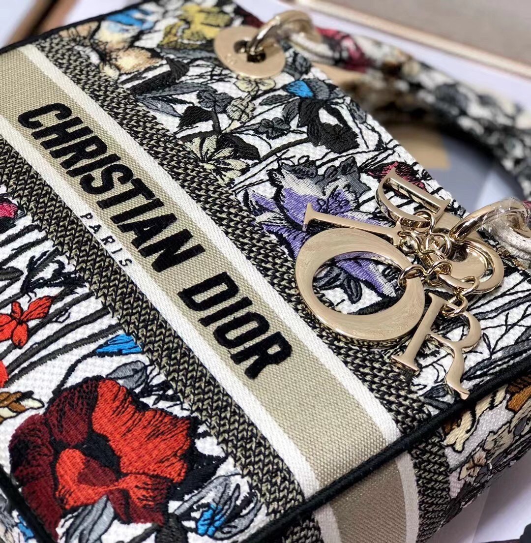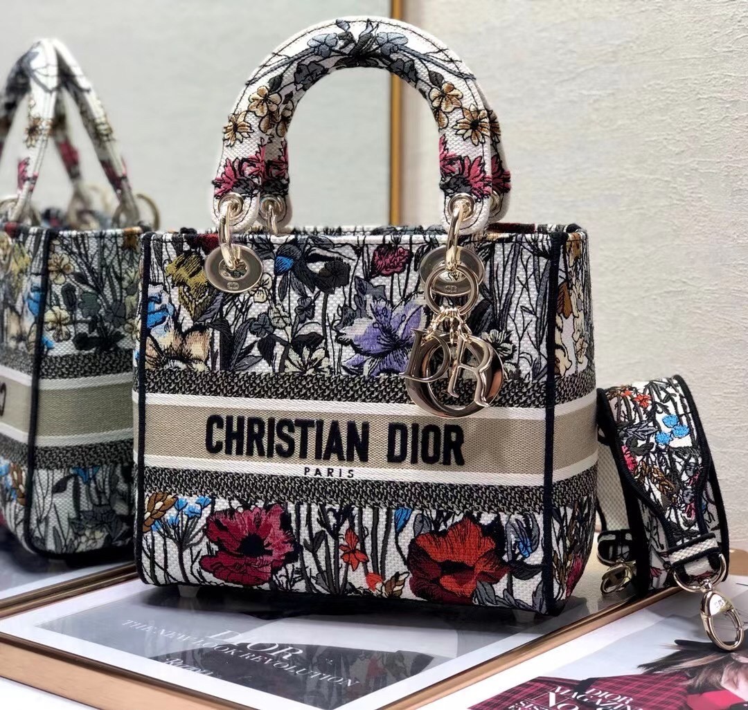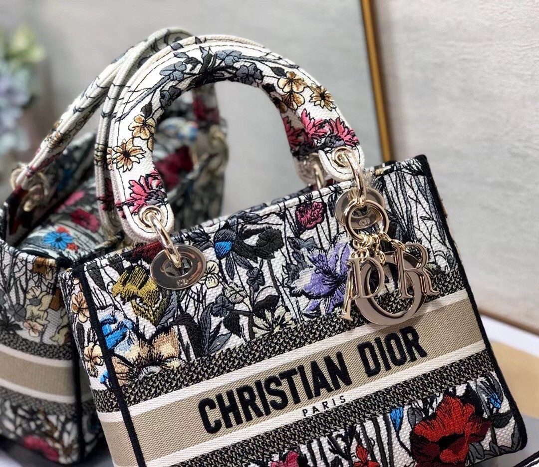 The Lady D-Lite bag combines classic elegance with the modernity of the House. The lightweight silhouette is embroidered with the Mille Fleurs motif which, inspired by bucolic Apulian landscapes, is a central theme of the collection. Featuring the ‘Christian Dior’ signature on the front along with the thick pale gold-finish metal ‘D.I.O.R.’ charms, it is equipped with a wide, reversible and removable embroidered shoulder strap. The medium bag can be carried by hand, worn over the shoulder or crossbody and can be paired with other Mille Fleurs creations of the season.