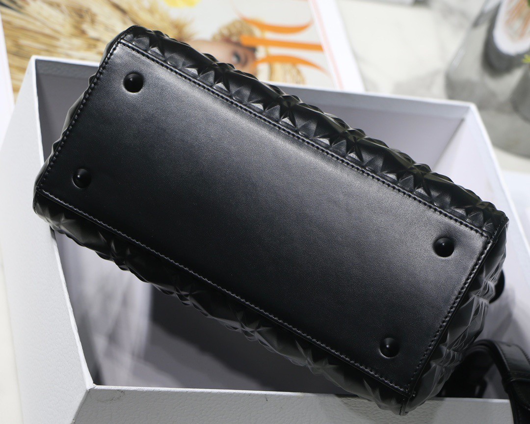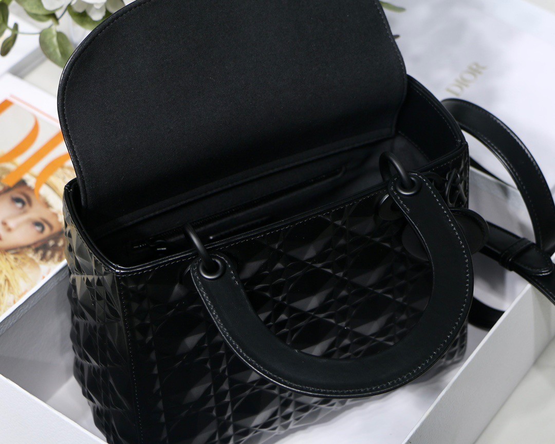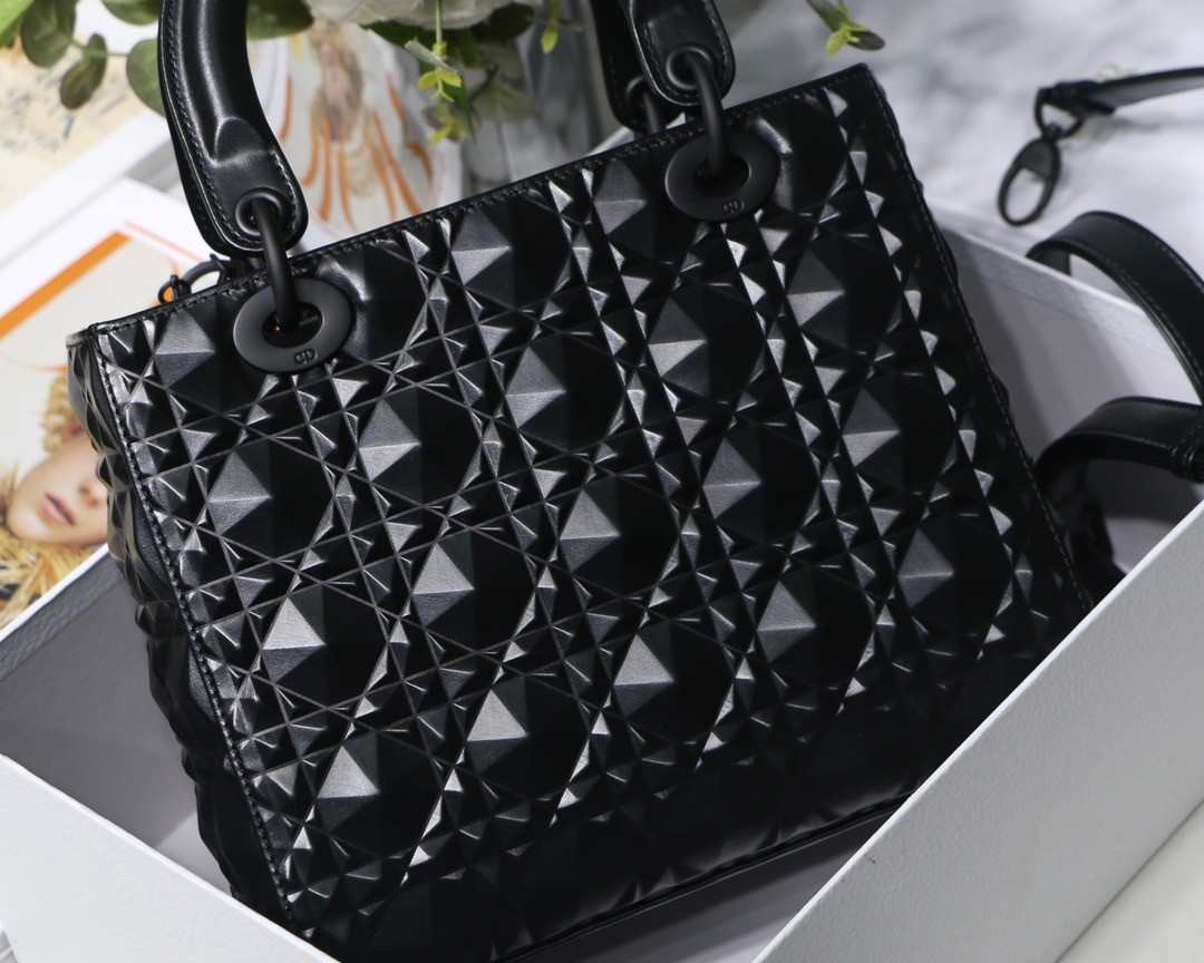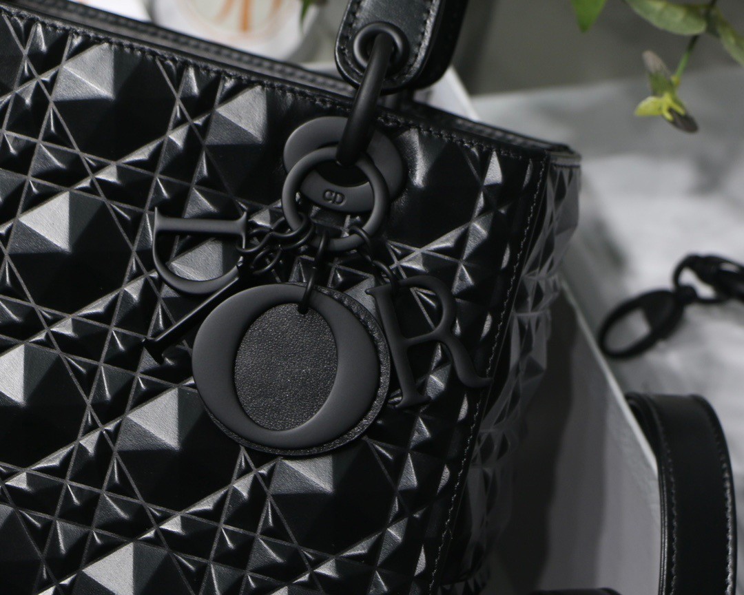 The Lady Dior bag epitomizes Dior’s vision of elegance and beauty. Sleek and refined, the timeless creation is crafted in black Cannage calfskin, showcasing a graphic interpretation of the House’s iconic motif. Tonal enamel ‘D.I.O.R.’ charms offer an elegant allure. Featuring a thin, removable leather shoulder strap, the medium Lady Dior bag can be carried by hand or worn crossbody.