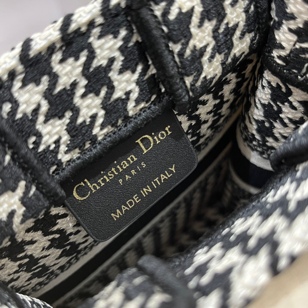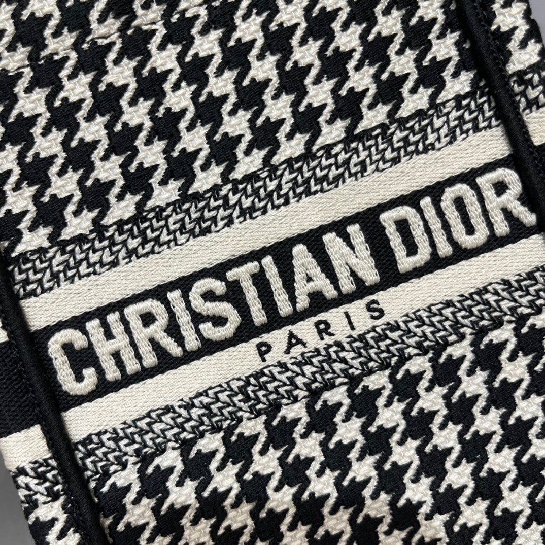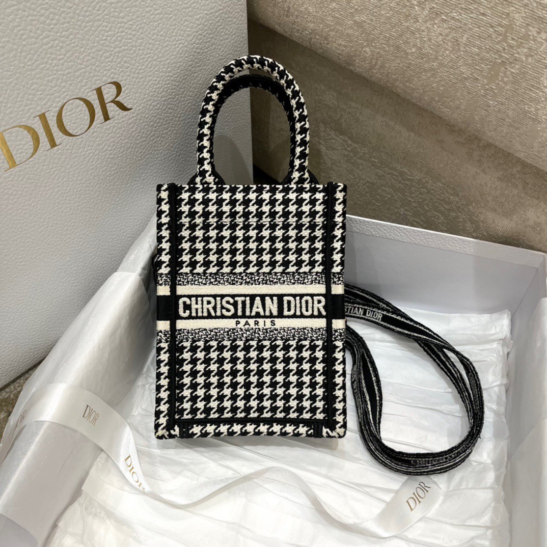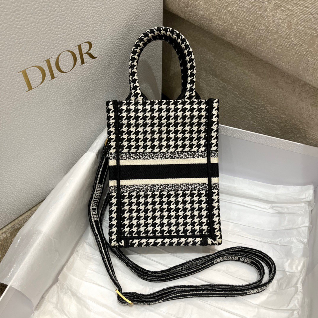Maria Grazia Chiuri’s phone bag enriches the iconic Dior Book Tote line with an ideal example of the House’s savoir-faire. The style is entirely embroidered with the black and white micro Houndstooth motif and is enhanced by the ‘CHRISTIAN DIOR PARIS’ signature on the front. The miniature bag will accommodate a phone as well as the small daily essentials. Completed by an adjustable and removable embroidered shoulder strap, the modern accessory can be carried by hand, worn over the shoulder or crossbody.