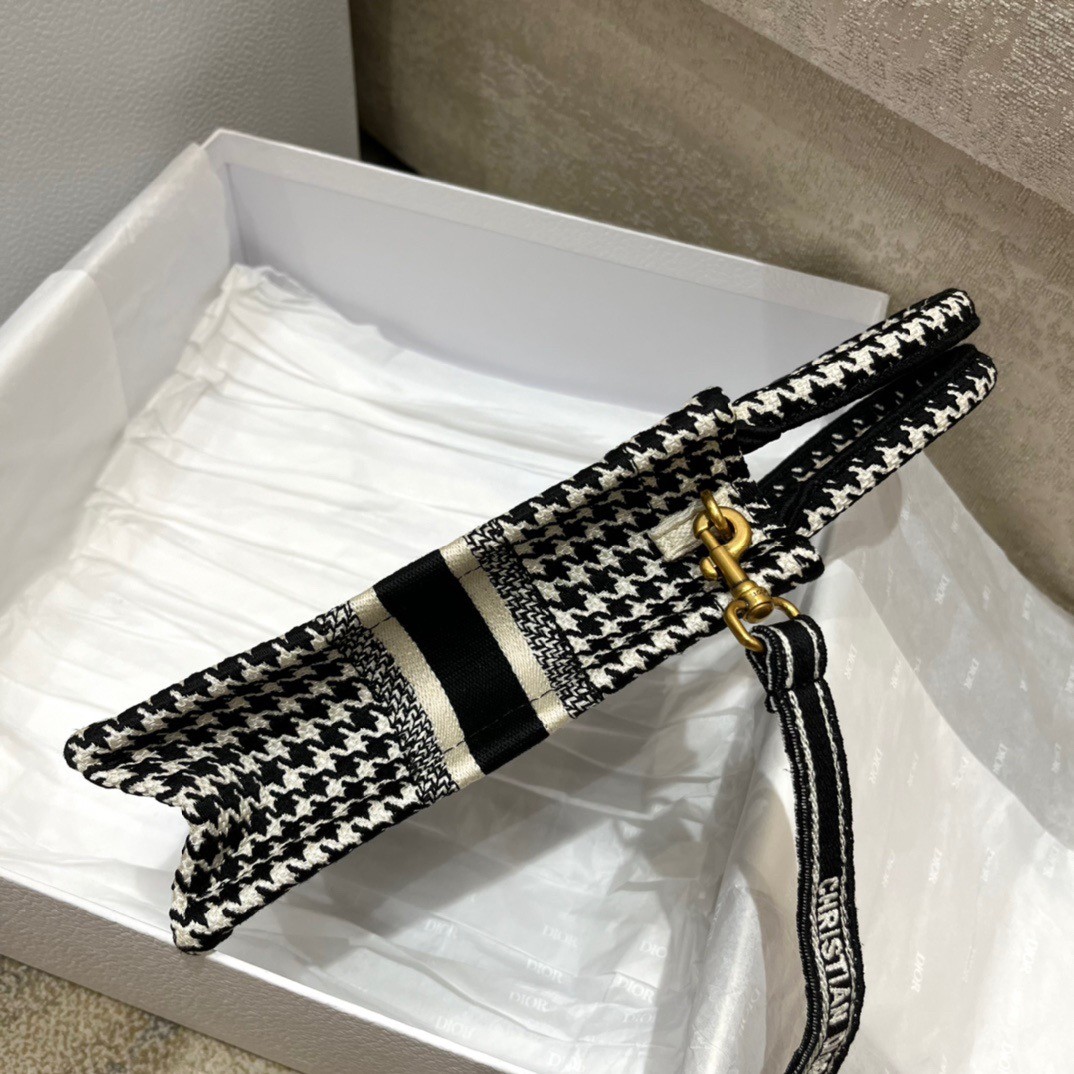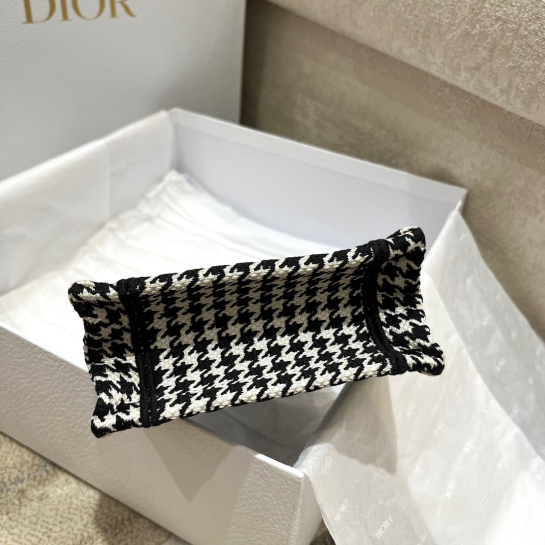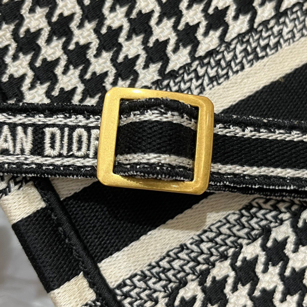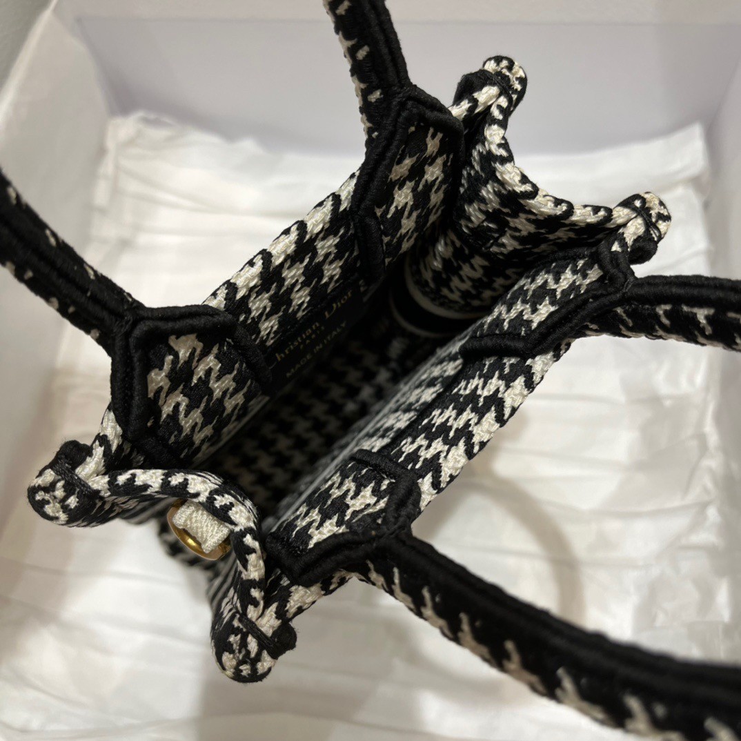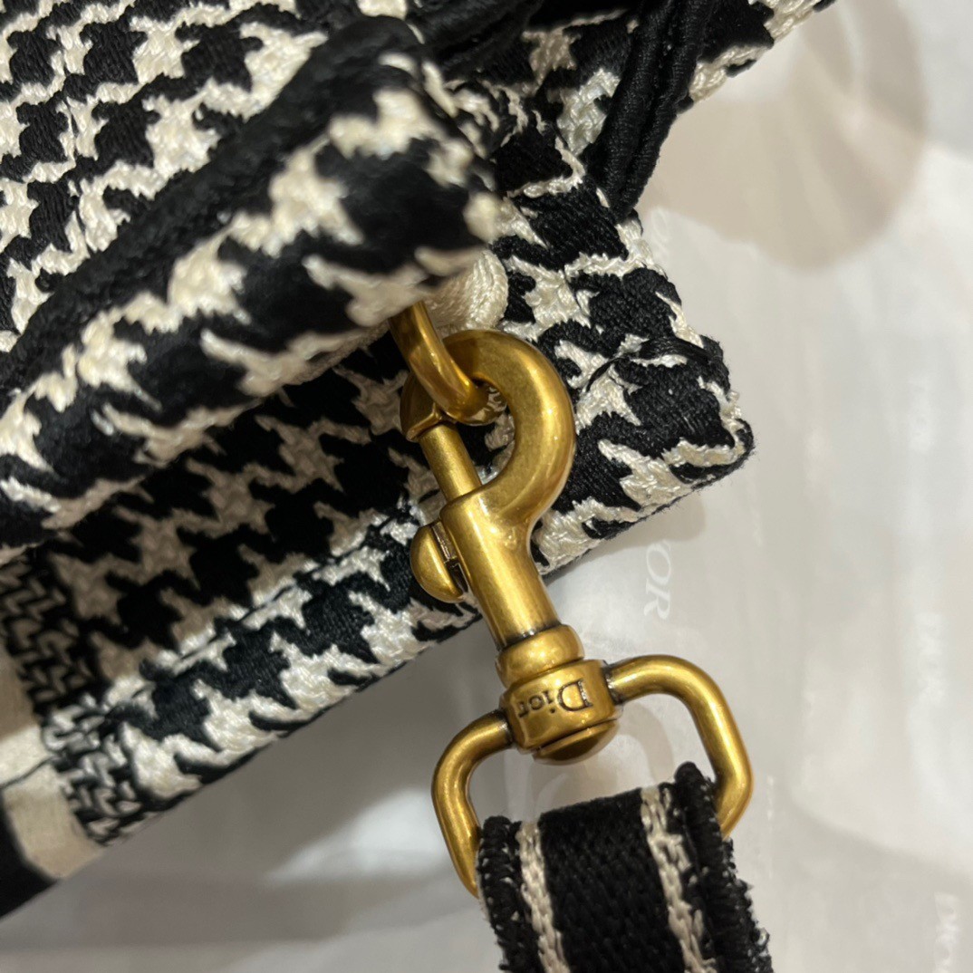 Maria Grazia Chiuri’s phone bag enriches the iconic Dior Book Tote line with an ideal example of the House’s savoir-faire. The style is entirely embroidered with the black and white micro Houndstooth motif and is enhanced by the ‘CHRISTIAN DIOR PARIS’ signature on the front. The miniature bag will accommodate a phone as well as the small daily essentials. Completed by an adjustable and removable embroidered shoulder strap, the modern accessory can be carried by hand, worn over the shoulder or crossbody.