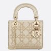 The Lady Dior bag embodies Dior’s vision of elegance and beauty. Sleek and refined, the timeless yet modern style is rafted in platinum metallic lambskin and embroidered with faceted beads that capture the light and create a Cannage motif, while the pale gold-finish metal ‘D.I.O.R.’ charms further embellish its silhouette. The miniature style, an ideal evening wear companion, has a removable chain shoulder strap.