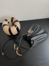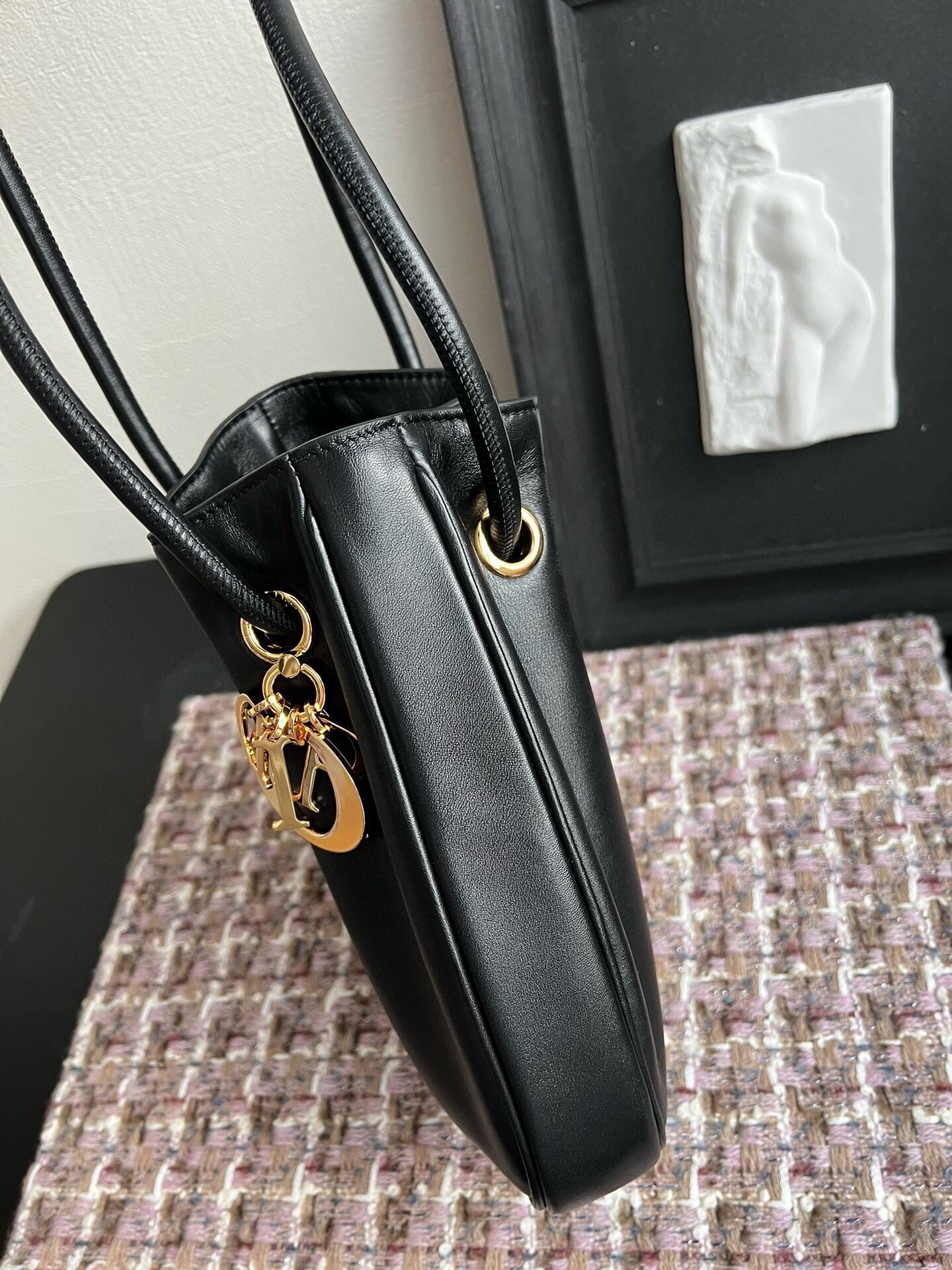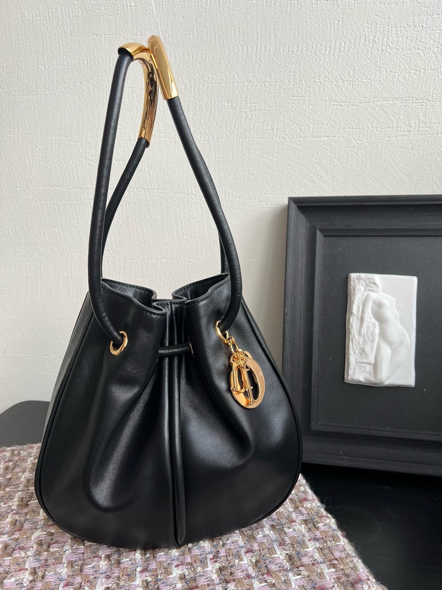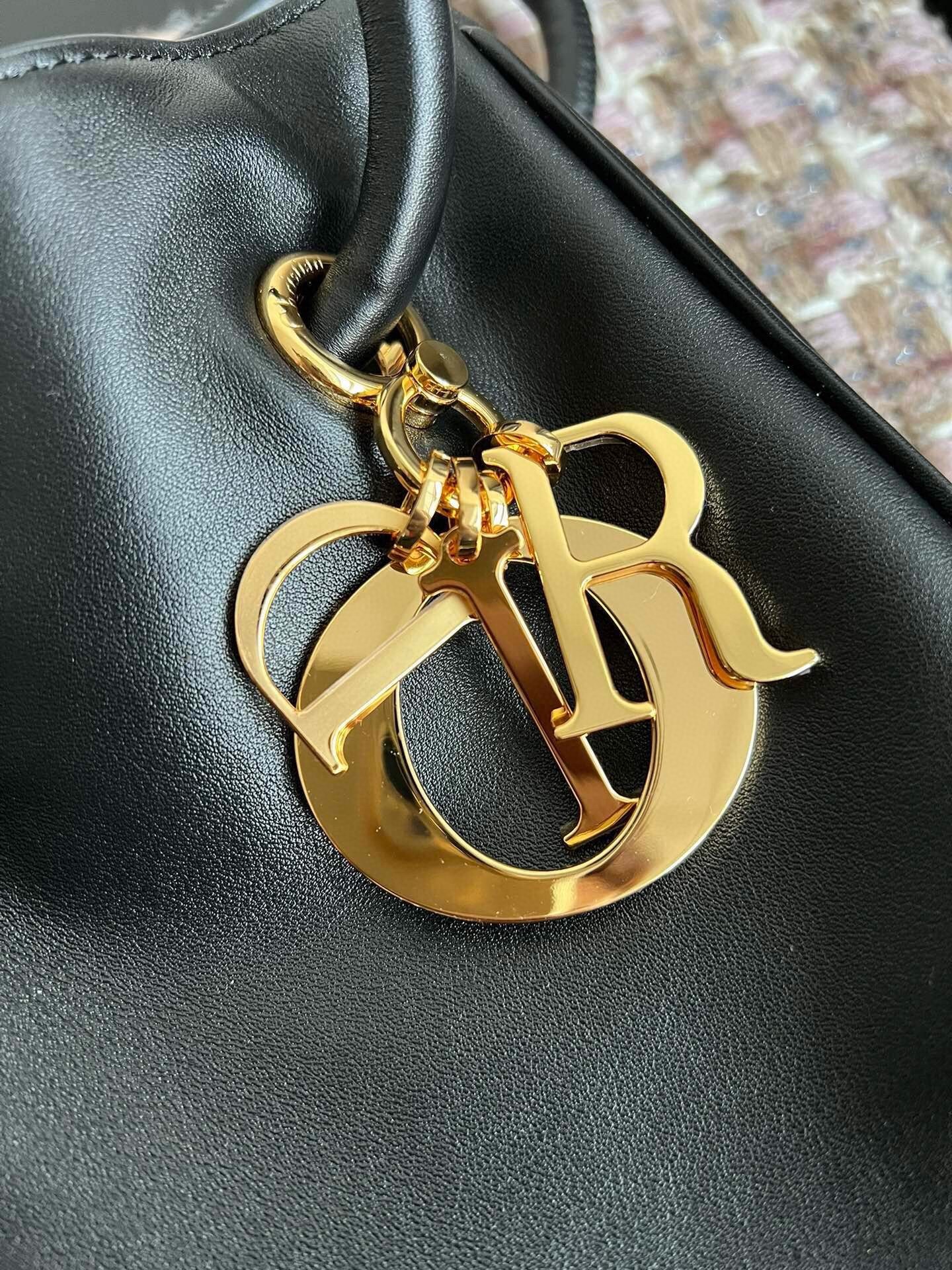 New for Fall 2024, the Dior Nolita bag redefines House codes of modern elegance with a refined and contemporary silhouette. The black calfskin is complemented by structured top handles embellished with antique gold-finish metal, as well as sliding D.I.O.R. charms which lend a touch of movement. The drawstring closure reveals a practical interior with a slip pocket, while the adjustable and removable leather strap allows the medium bag to be carried by hand, worn over the shoulder or crossbody.