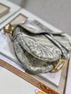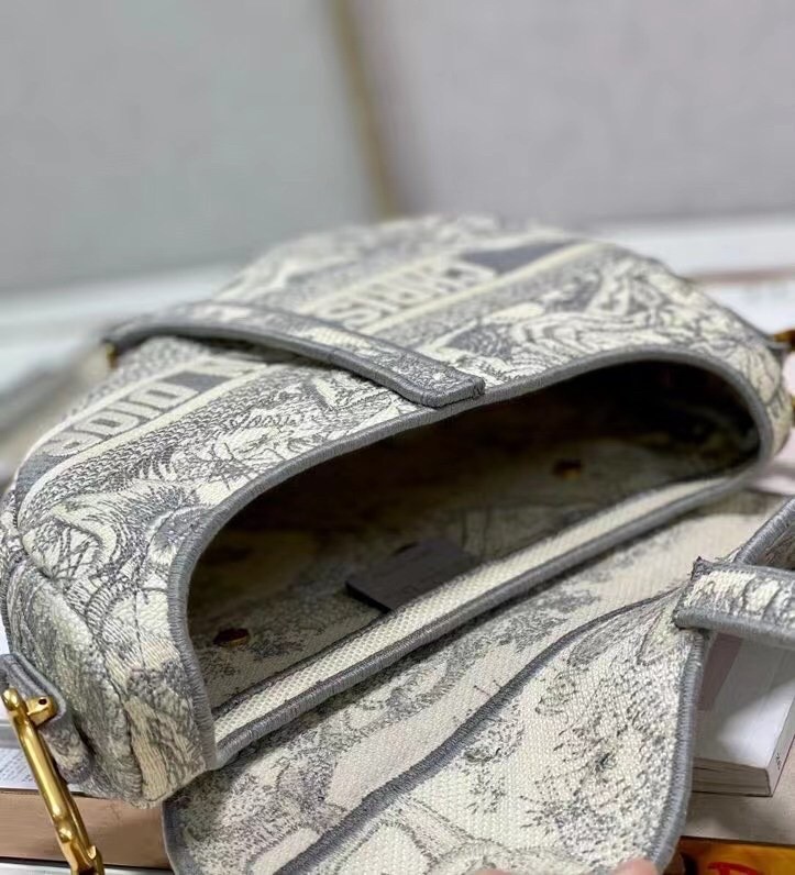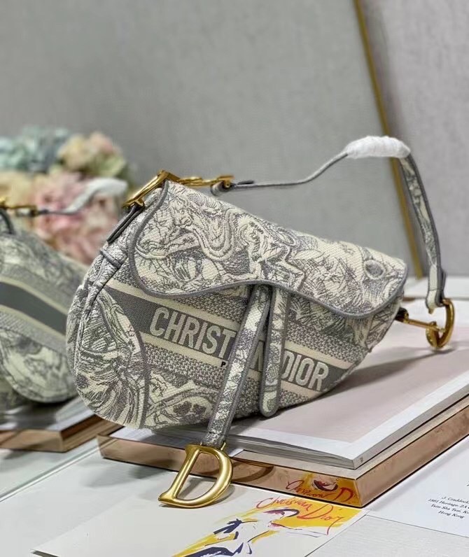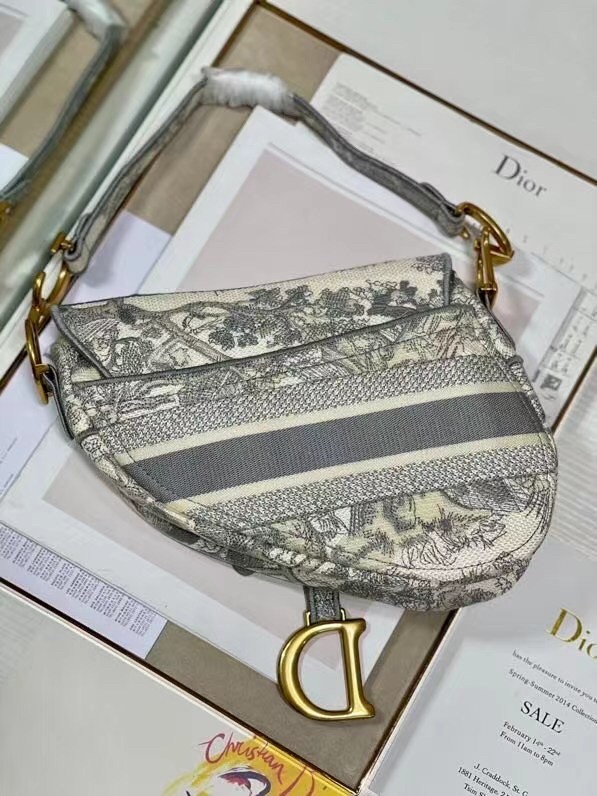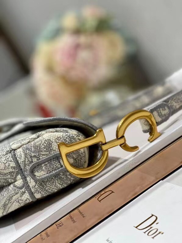 Maria Grazia Chiuri brings a fresh update to the iconic Saddle bag. The design is fully embroidered with the hallmark Toile de Jouy motif, further enhanced by a ‘CHRISTIAN DIOR’ signature on the front. The legendary design features a Saddle flap with a magnetic ‘D’ stirrup clasp and boasts an antique gold-finish metal ‘CD’ signature on each side of the handle. The bag can be customized with different shoulder straps and may be coordinated with the season’s other Toile de Jouy creations.