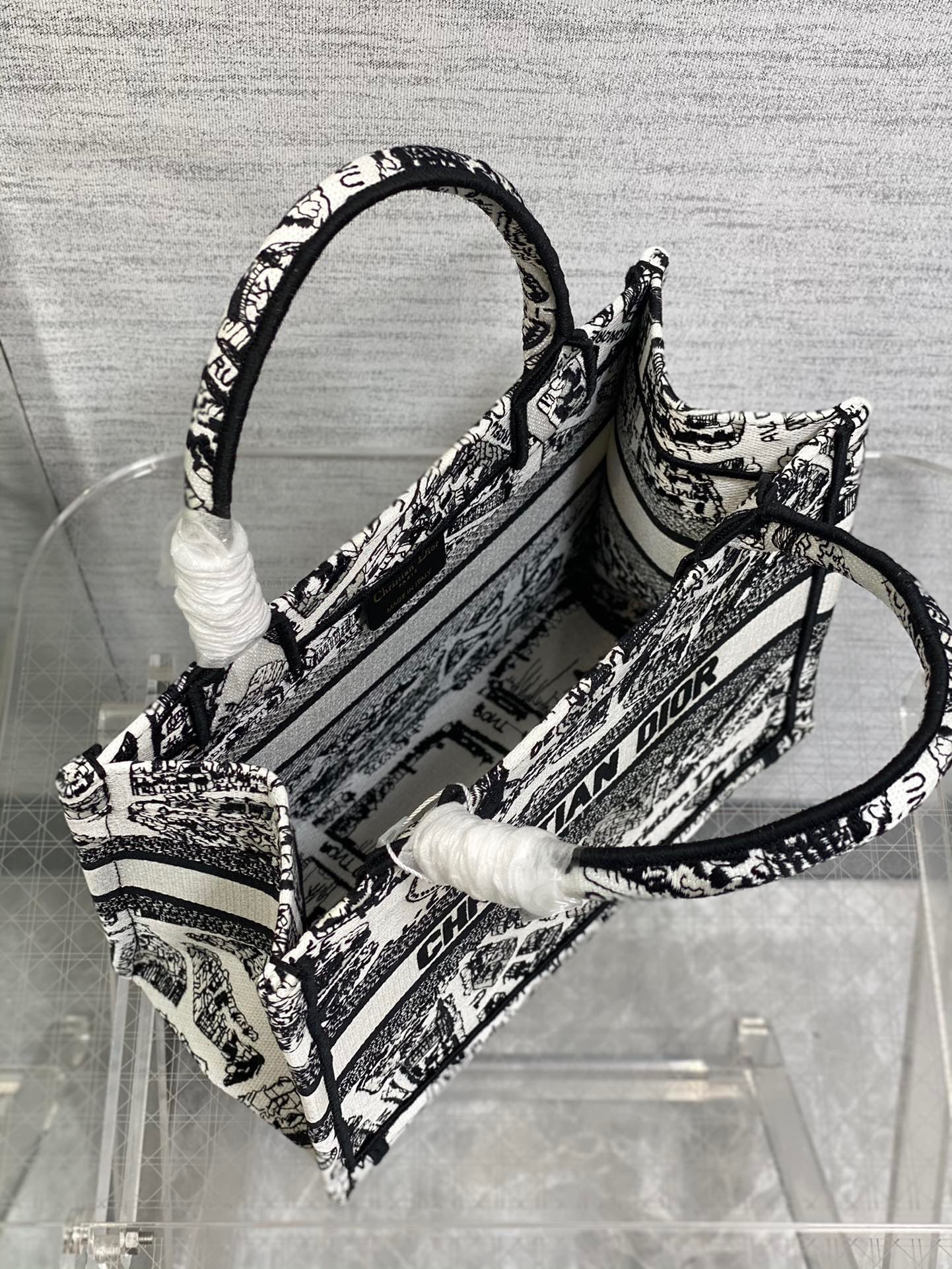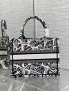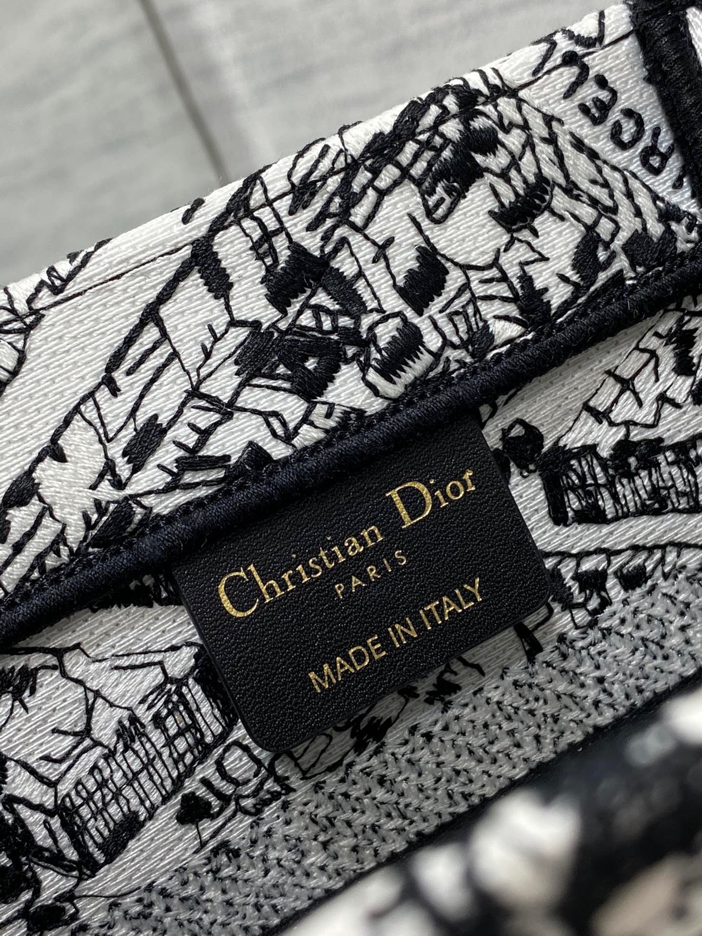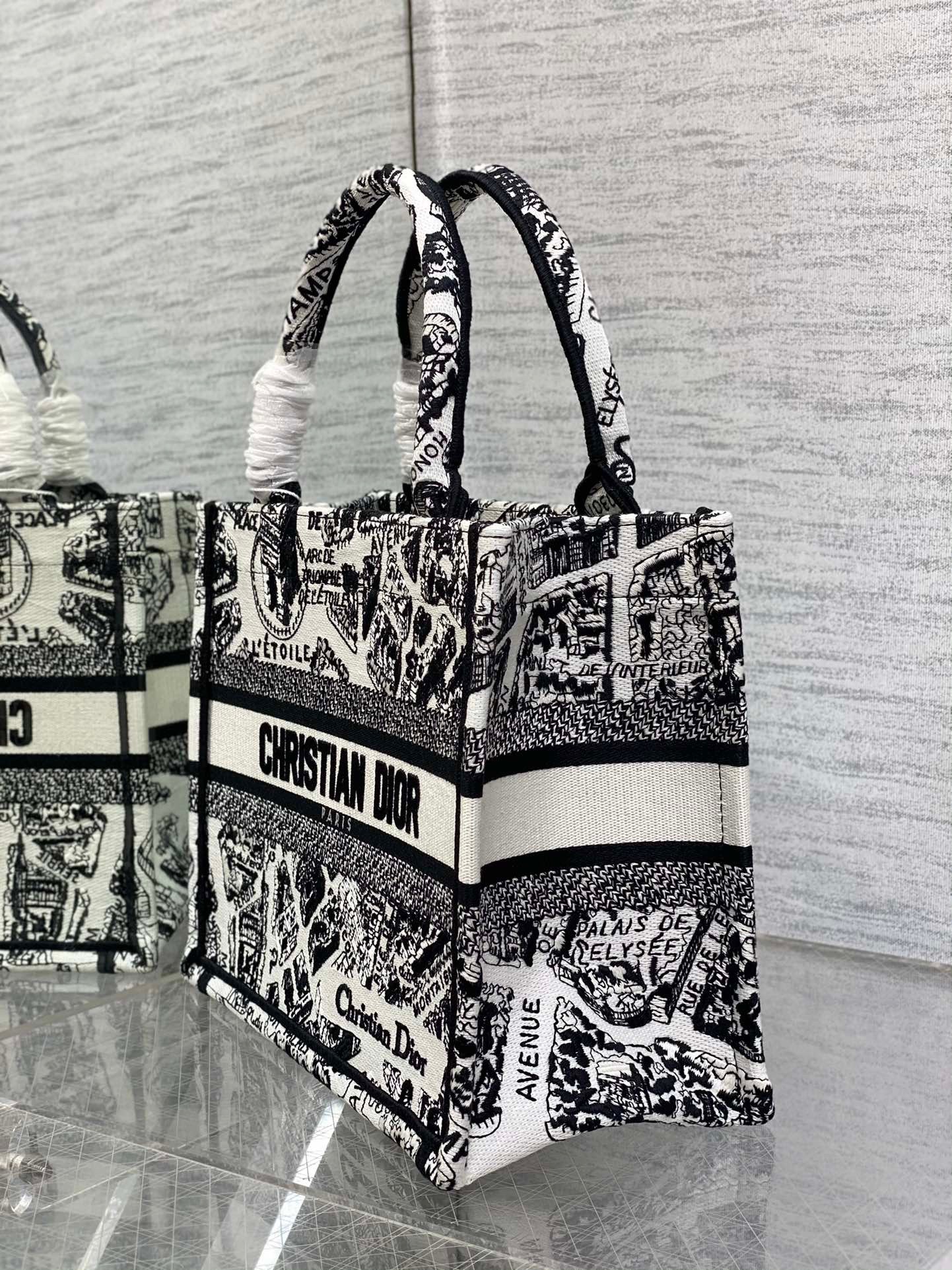 Introduced by Maria Grazia Chiuri, Creative Director of Christian Dior, the Dior Book Tote has become a staple of the Dior aesthetic. Designed to hold all the daily essentials, the style is fully embroidered with the season’s signature white and black Plan de Paris motif, inspired by the House archives and centered around Dior’s historic address on Avenue Montaigne. Adorned with the Christian Dior Paris signature on the front, the small tote exemplifies the House’s signature savoir-faire and may be carried by hand.