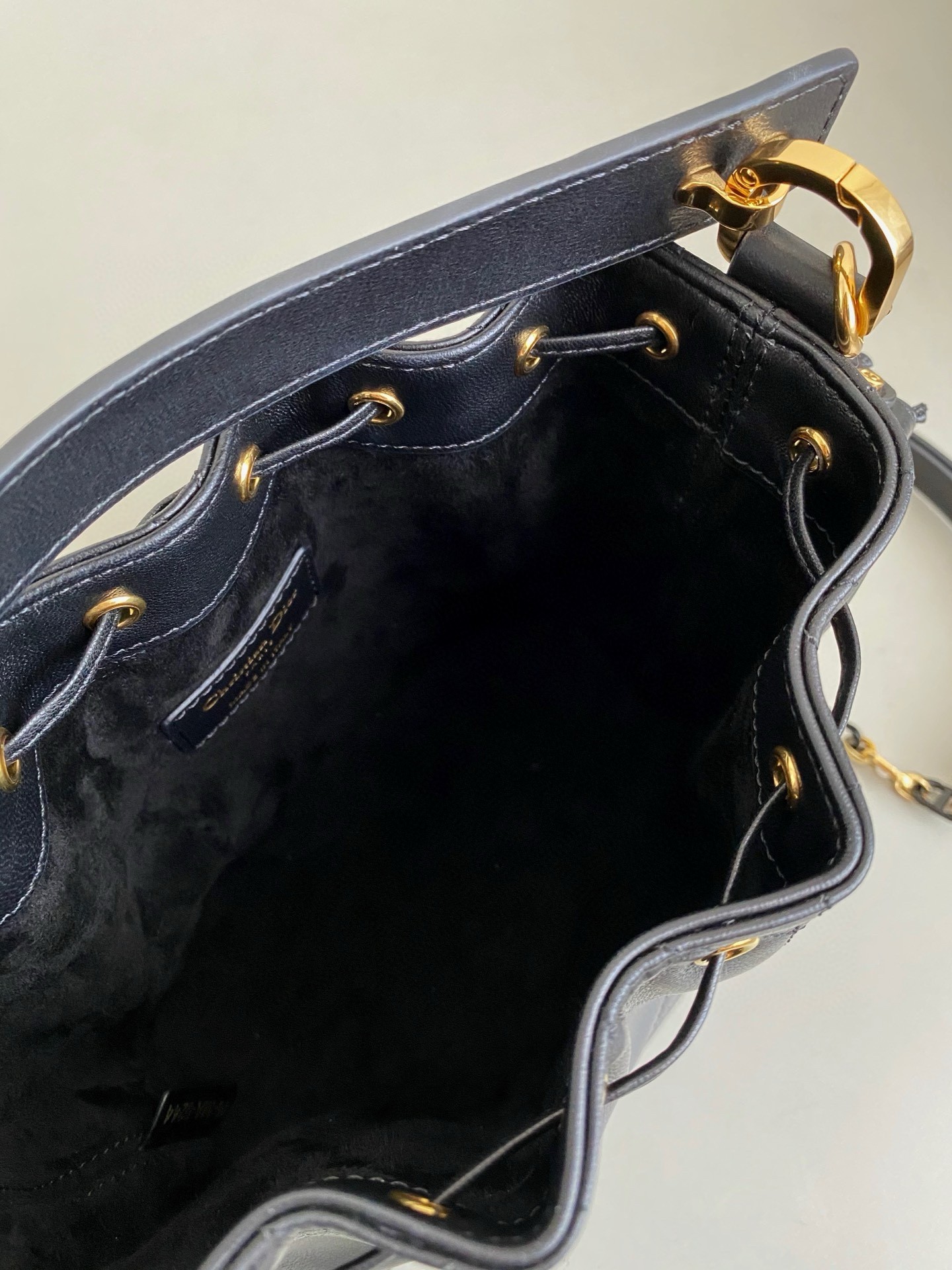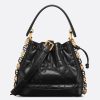 New for Fall 2024, the Dior Jolie bucket bag is a modern creation. Constructed in lambskin and calfskin with Macrocannage stitching, it has a drawstring closure and spacious interior. Featuring a removable black leather top handle and adjustable, removable CD link chain in gold-finish metal accented by resin pearls, the small contemporary bag can be carried by hand, worn over the shoulder or crossbody.