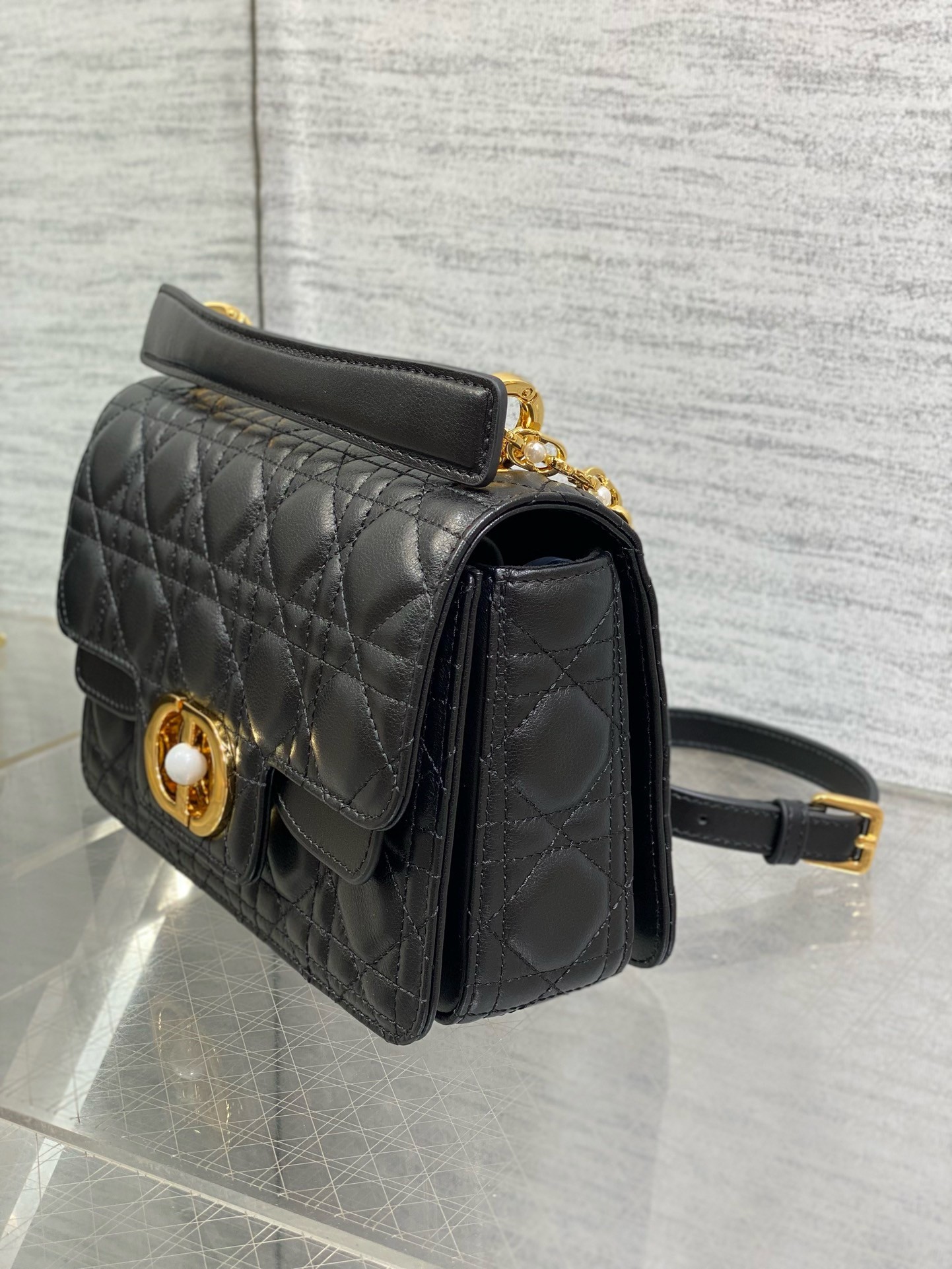 New for Summer 2024, the Dior Jolie Top Handle bag presents an elegant and functional design. It is crafted in calfskin with Cannage stitching and features a double flap enhanced by a CD signature embellished with a white resin pearl, as well as three compartments and a zip pocket to accommodate all the essentials, day or evening. The removable top handle is completed by a detachable chain strap with a leather insert and CD signature links embellished with white resin pearls, allowing the small bag to be comfortably carried by hand, worn over the shoulder or crossbody.