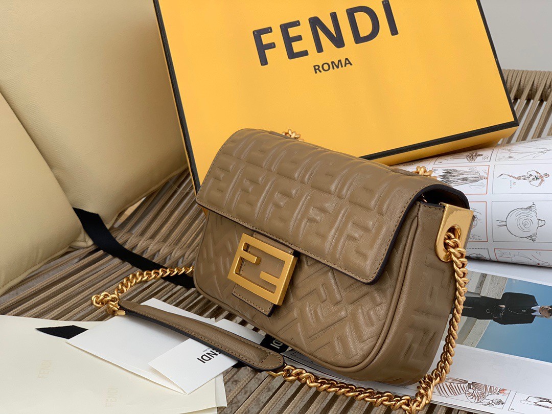 As Carrie Bradshaw once said of Fendi’s iconic style, “It’s not a bag, it’s a Baguette”. Made from soft nappa leather with a 3D texture FF motif, this version is designed with vintage gold-finish metalware, including the logo plaque fastening and adjustable chain strap that can be doubled up or worn cross-body.