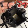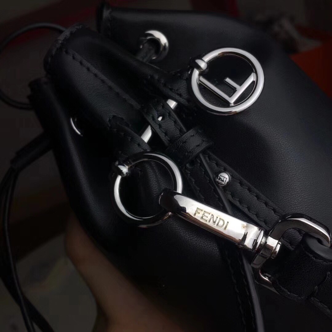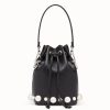 Small bucket bag with drawstring fastening and metal decorations in the form of the Fendi logo. The bag has two detachable shoulder straps, one long and one short, to wear the bag over the shoulder or cross-body. Made of calfskin leather. Decorated with pearls of two different sizes.