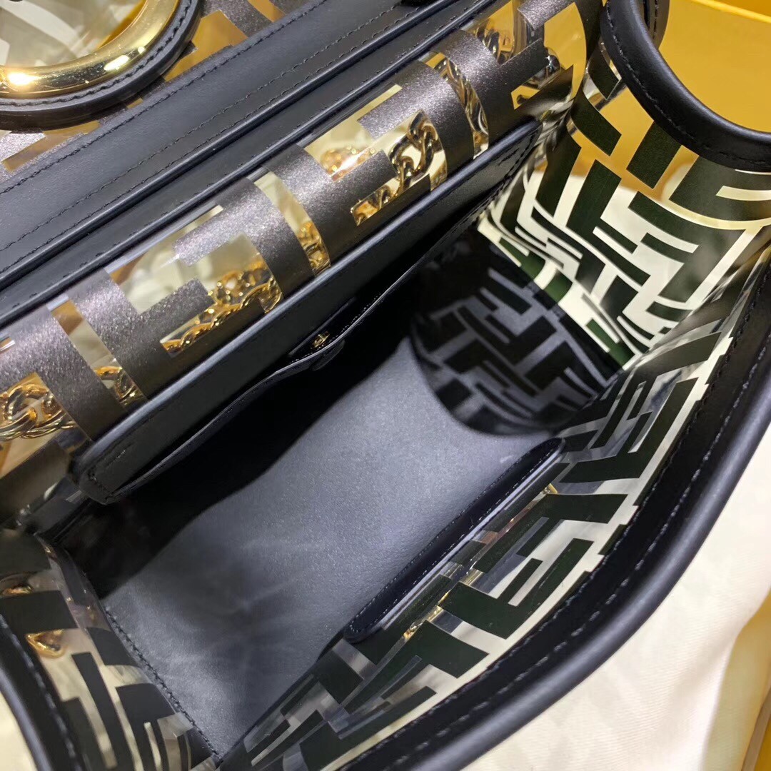 For their latest bag collection, the double-F logo steals the spotlight once again. Famous for being a part of Fendi’s trendsetting and luxurious bags, expect to see it as a bold graphic print or as a stylish metal embellishment. This Transparent PU Kan I F small shoulder bag from Fendi features a foldover top, a main internal compartment, a chain and leather shoulder strap, the new Fendi logo on the front and hand-painted FF motifs all over.