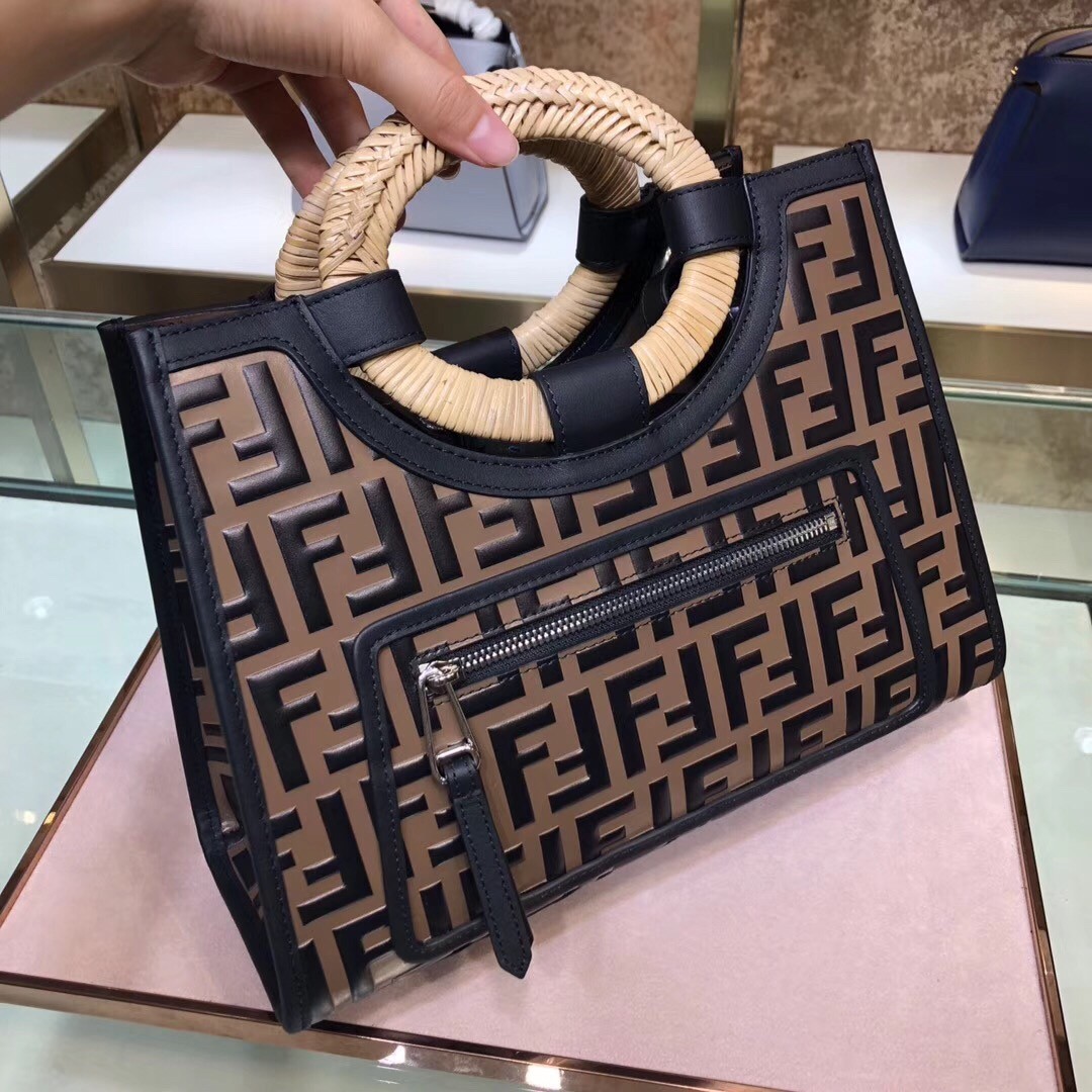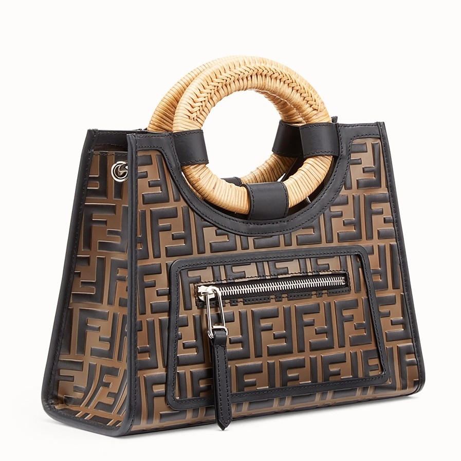 This season the sleek line of Fendi bags are highlighted by the iconic Fendi logo. Steal the spotlight by adding one of these designs that work for every occasion to your wardrobe. This brown calf leather and straw Runaway shopper bag from Fendi features a front zip pocket, a detachable shoulder strap, a main internal compartment, contrasting light brown rigid oval top handles and an embossed FF logo pattern all over.