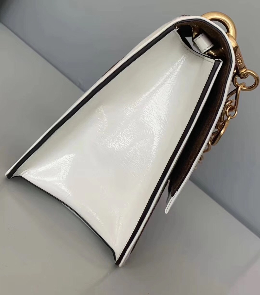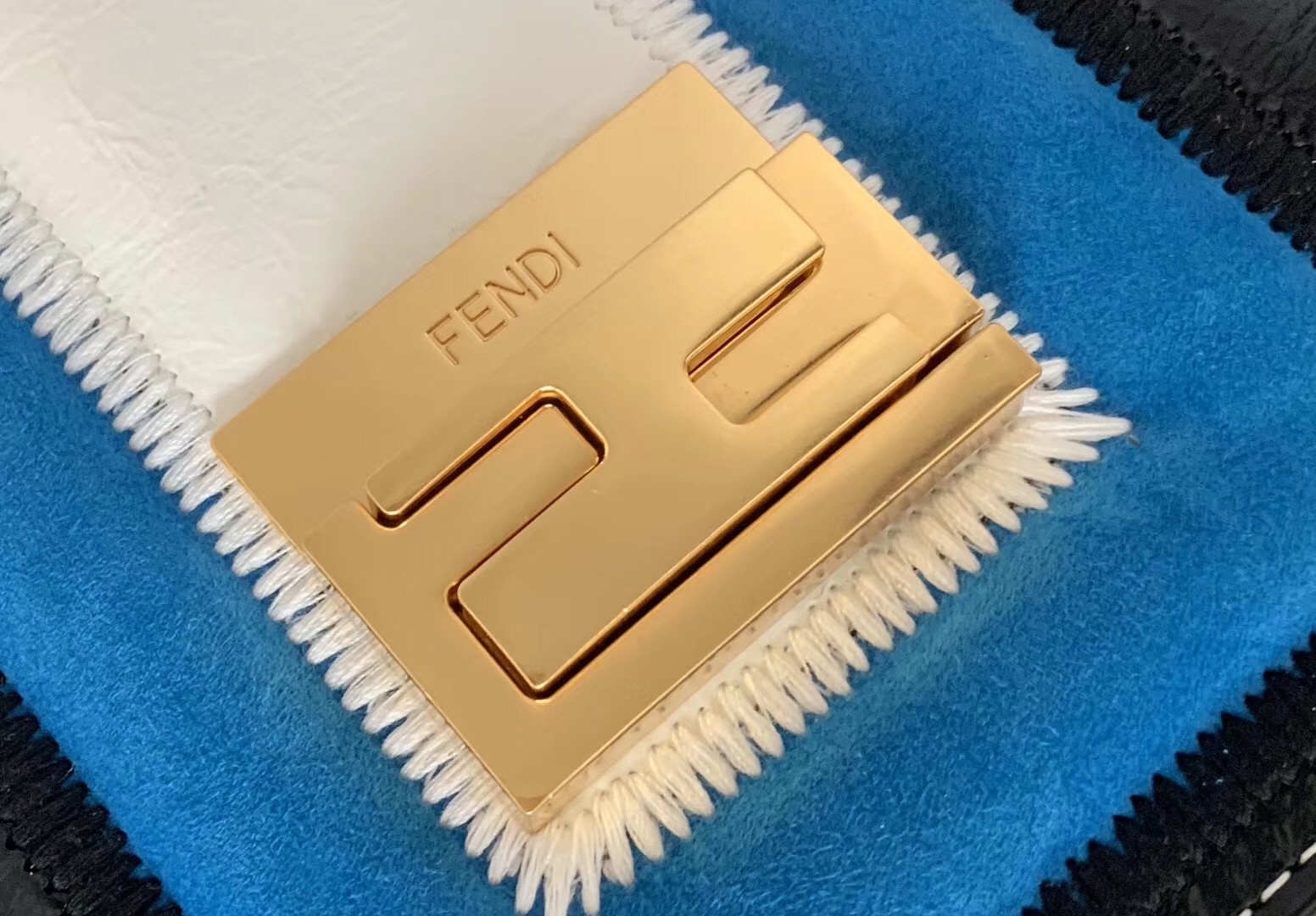 – Geometric flap with embossed corners and an iconic FF press-stud fastening