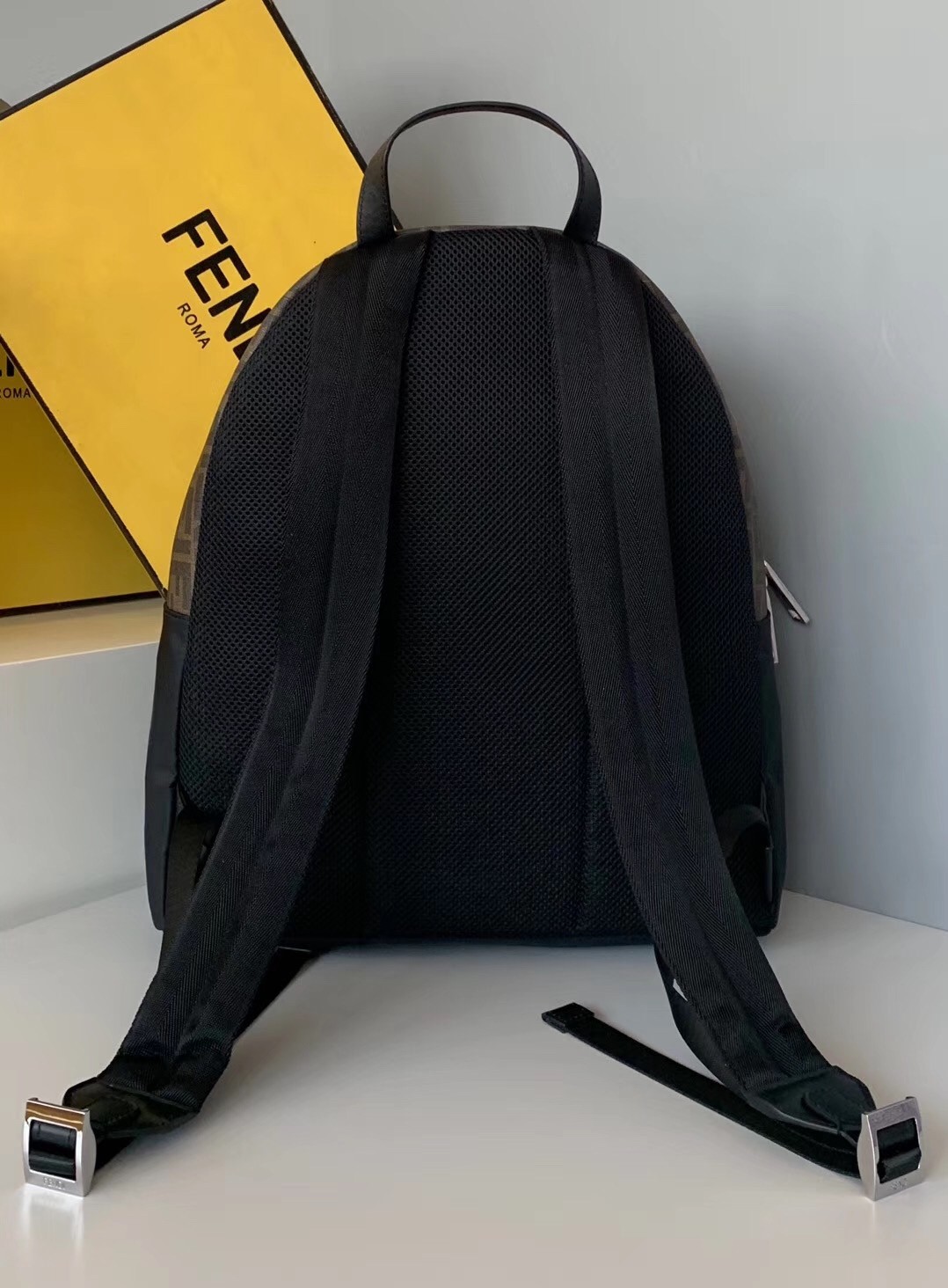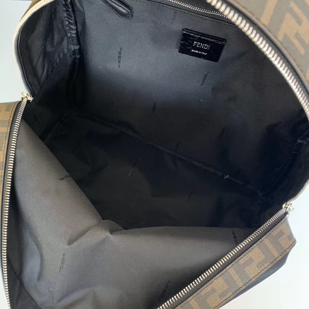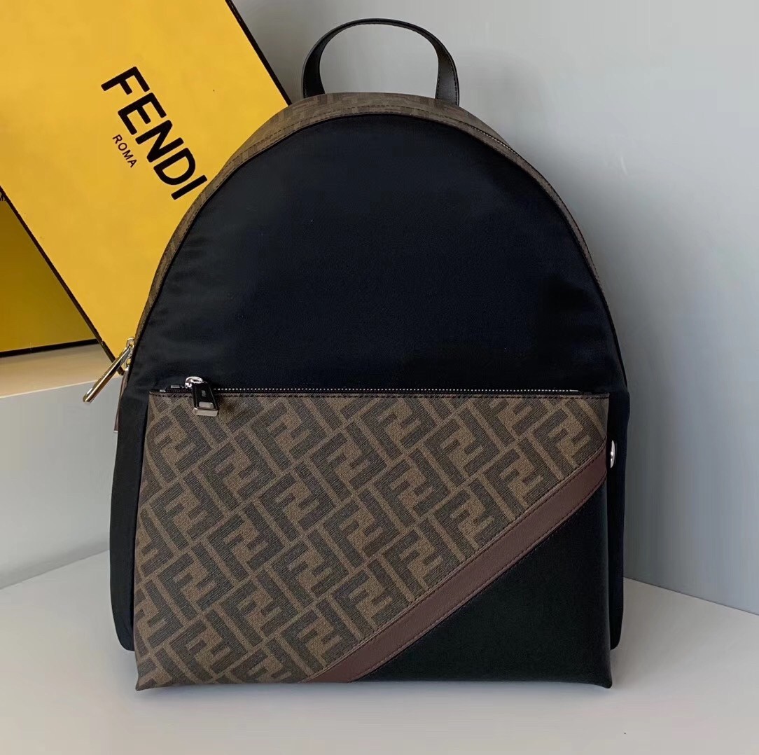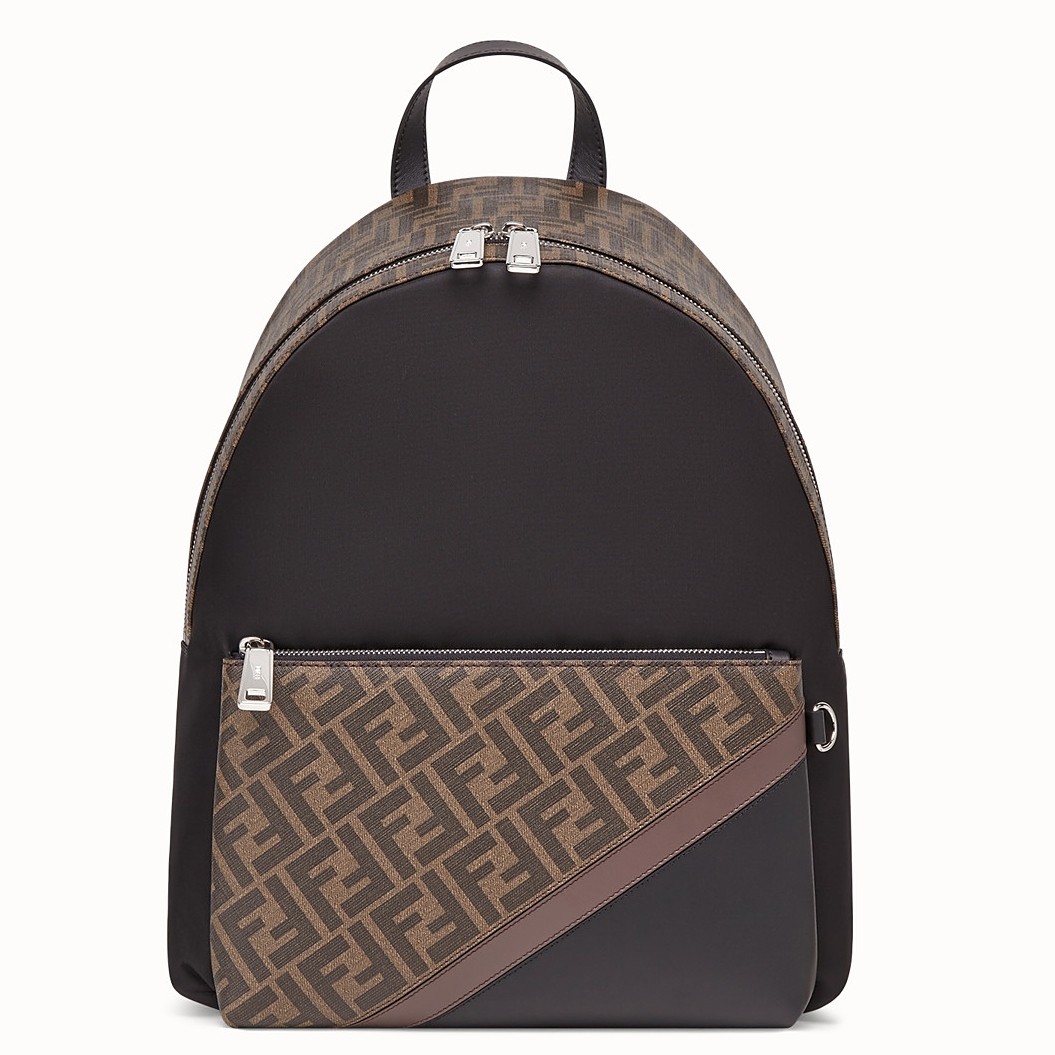 Large backpack with front pocket. Breathable technical mesh back and adjustable shoulder straps. Zip fastening with double slider and inside pocket. Made with black nylon. Finished with fabric insert with FF motif and black leather inlaid detail in shades of brown. Palladium-finish metalware.