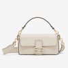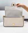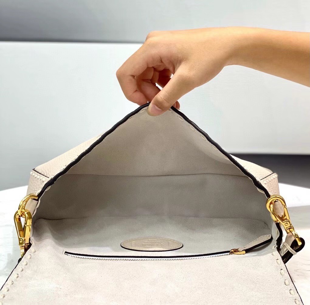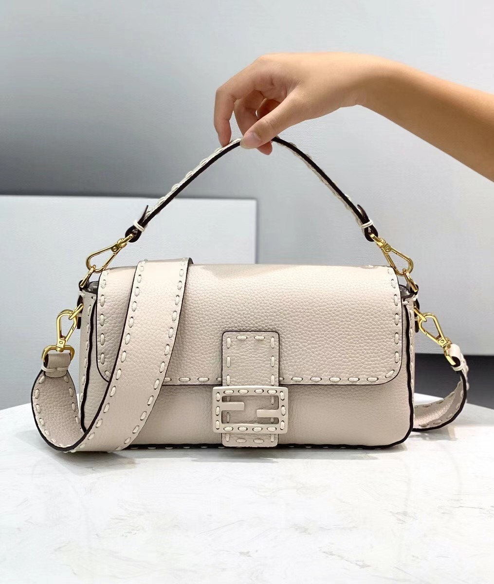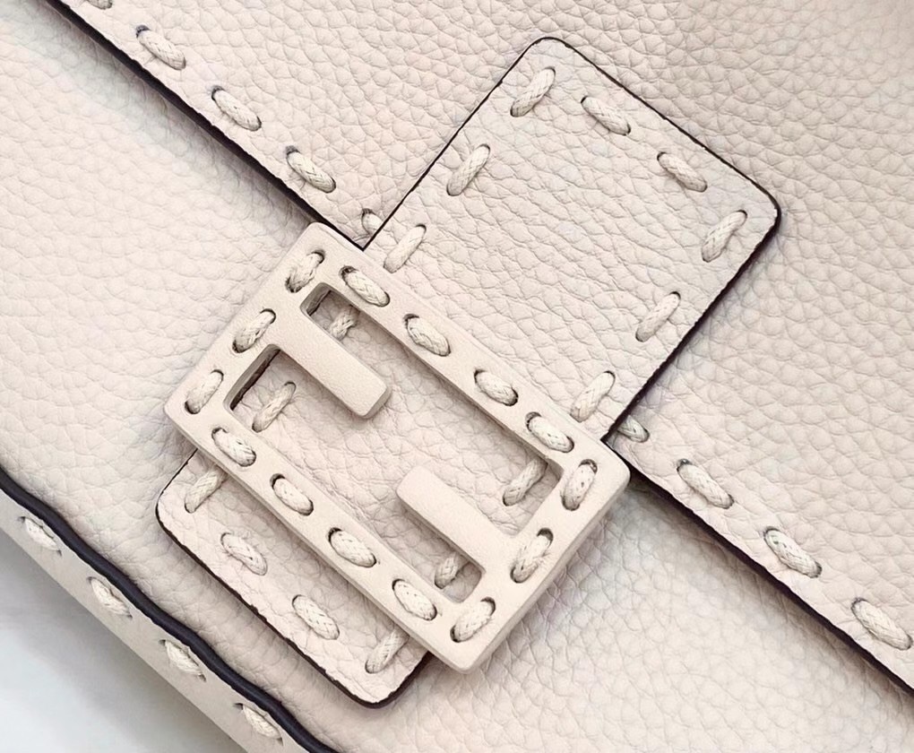 Iconic medium Baguette bag, made of camellia-colour full grain leather with macro hand stitching and decorated with an FF clasp. Featuring a front flap, magnetic clasp, internal compartment with zip pocket and gold-finish metalware. The bag can be carried by hand, or worn either on the shoulder or cross-body thanks to the handle and shoulder strap, both detachable.