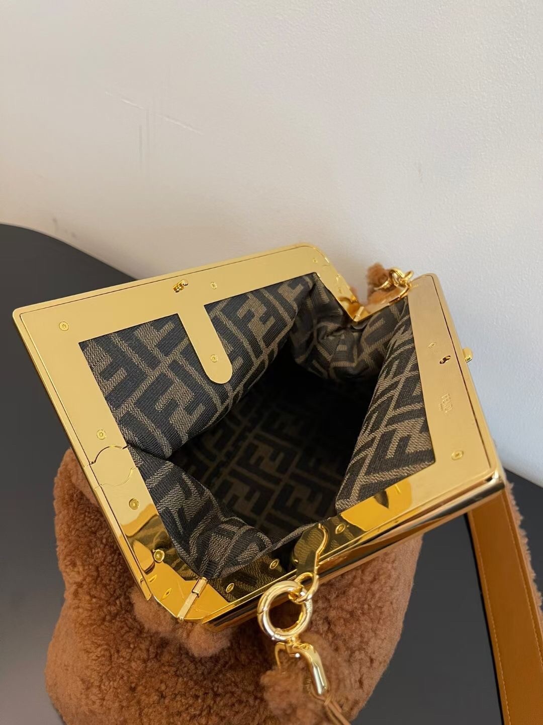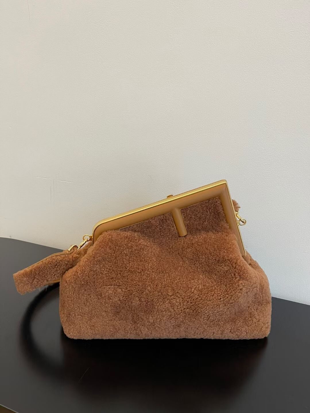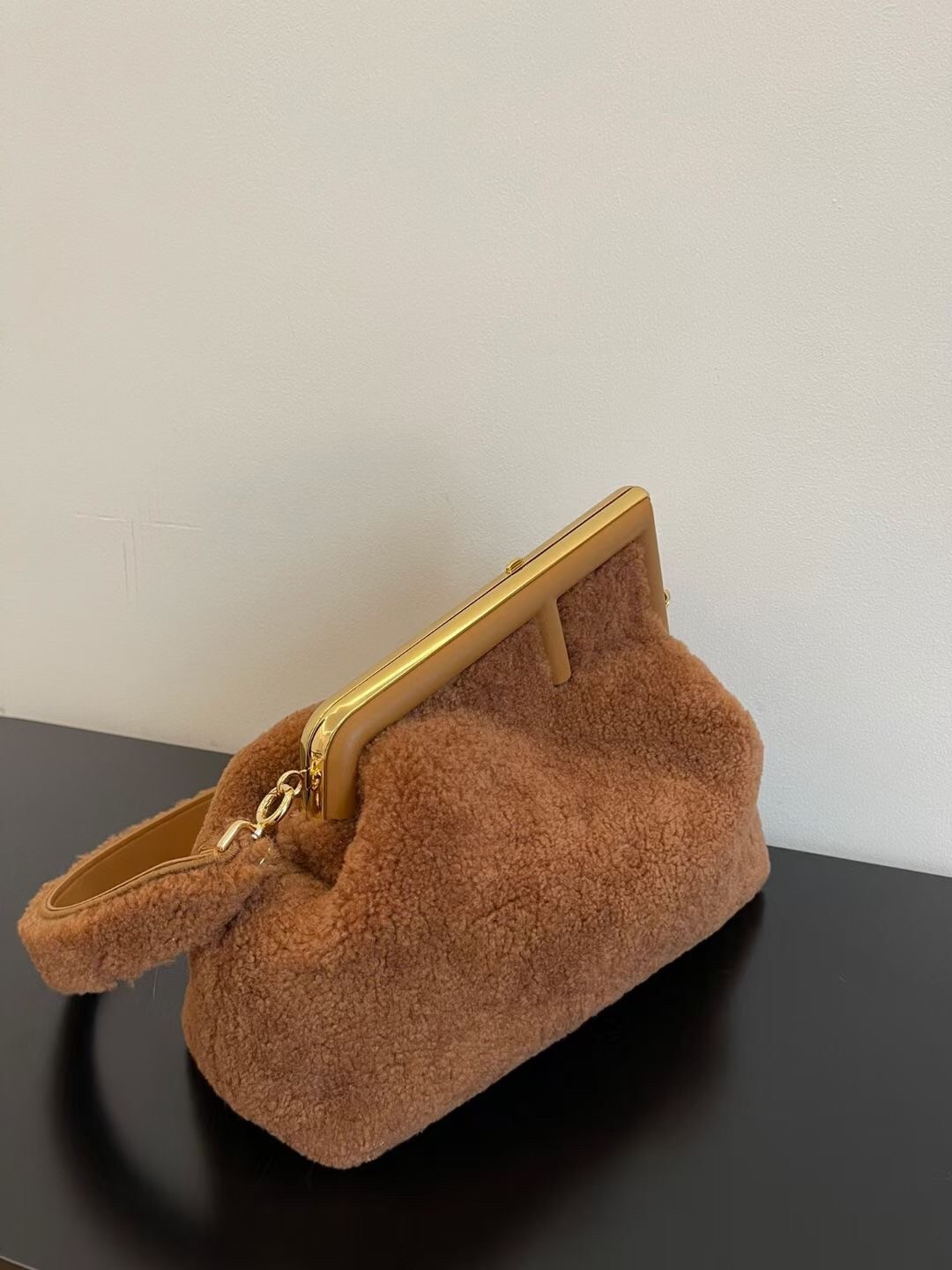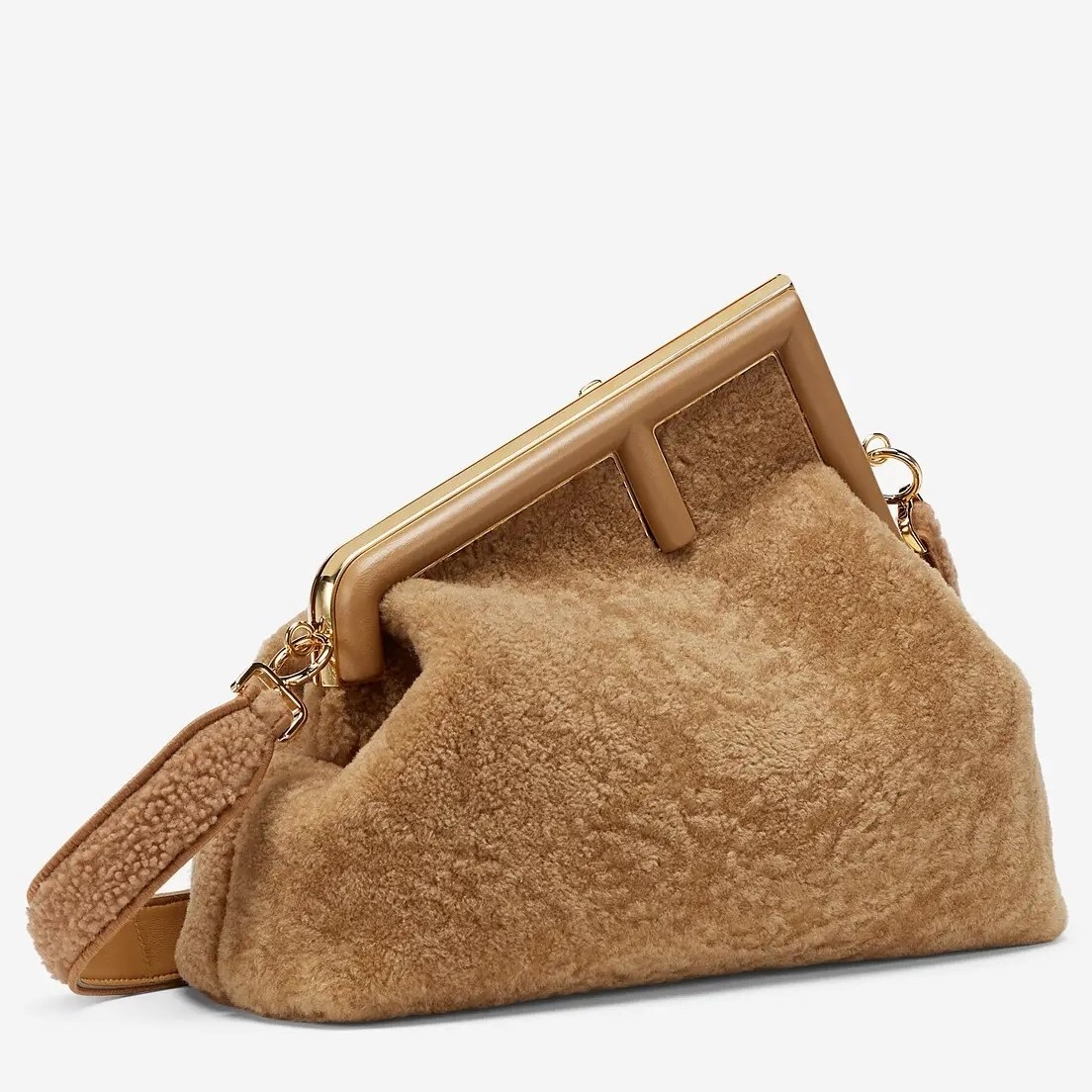 Fendi First medium bag made of soft brown merino sheepskin with oversized metal F clasp bound in tone on tone nappa leather. Featuring an interior compartment lined in fabric with the iconic FF motif, removable inner hooks and gold-finish metalware. Can be carried by hand as a clutch or worn on the shoulder thanks to the detachable shoulder strap.