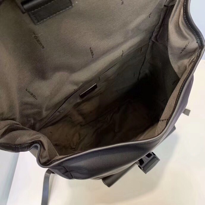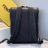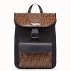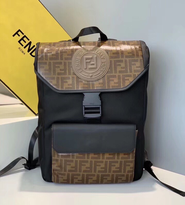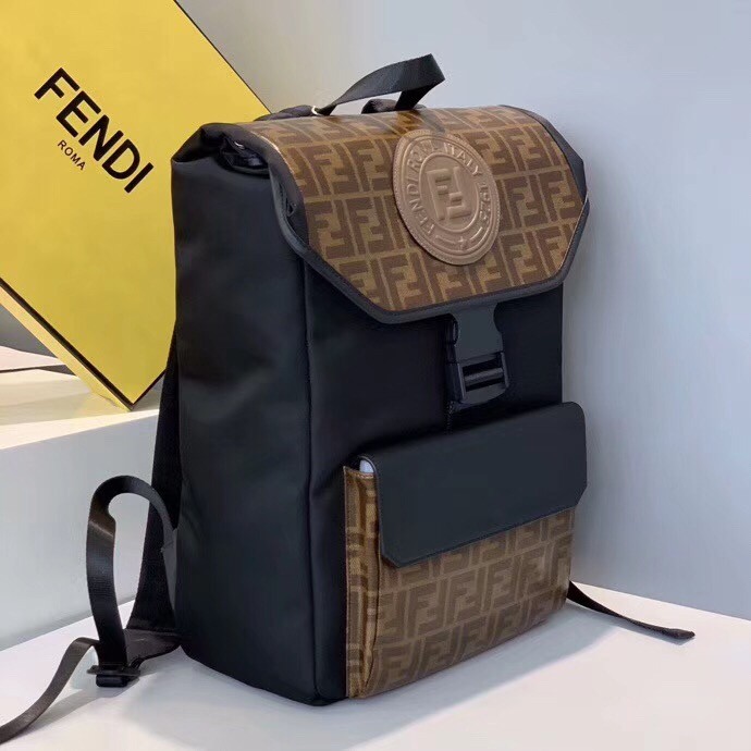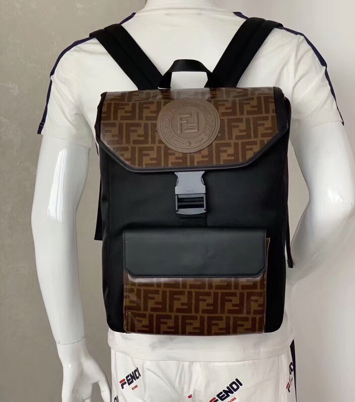 Wide-design backpack, closure with single buckle. Front pocket with flap and internal pockets. Technical mesh back and adjustable shoulder straps. Made of black nylon. Flap and pocket made of glazed fabric with brown FF motif. Decorated with Fendi Stamp appliqu?? in leather.