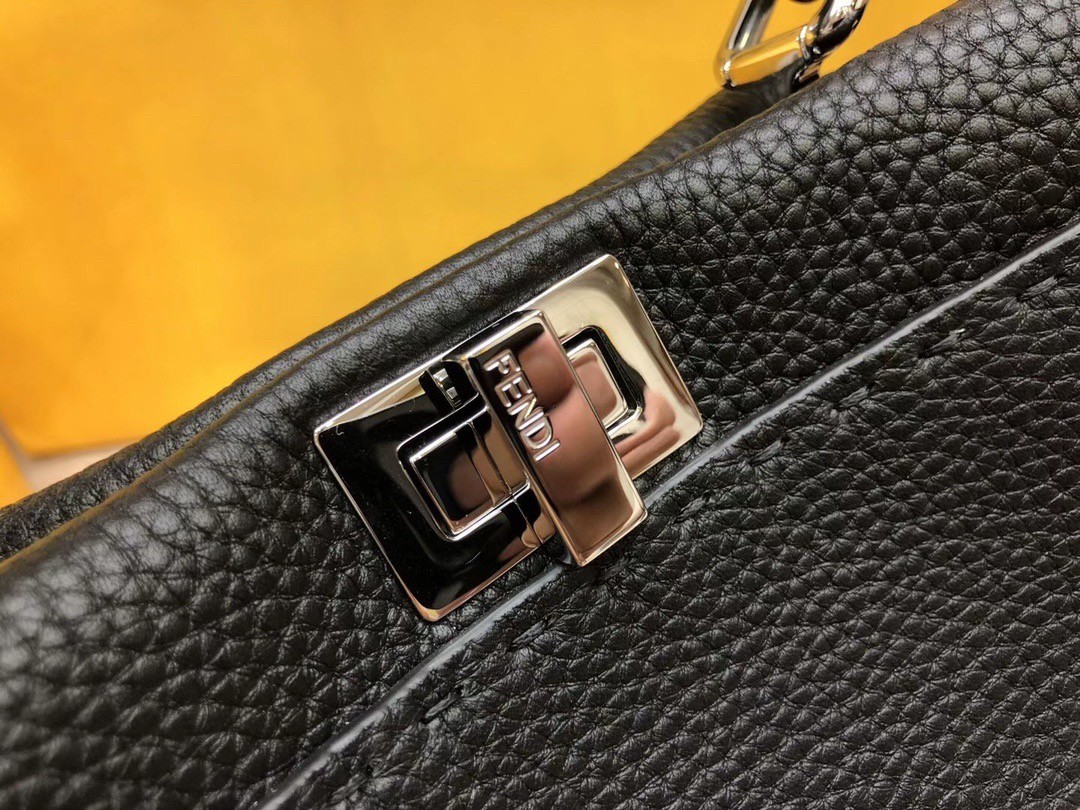 Fendi’s Peekaboo mini bag made of black Cuoio Romano leather, finished with hand stitching and embellished with the classic twist lock on both sides. Featuring a brown leather interior with two compartments separated by a stiff partition, an inner zip pocket and palladium-finish metalware.The bag can be carried by hand or worn either on the shoulder or cross-body thanks to the handle and adjustable, detachable shoulder strap.