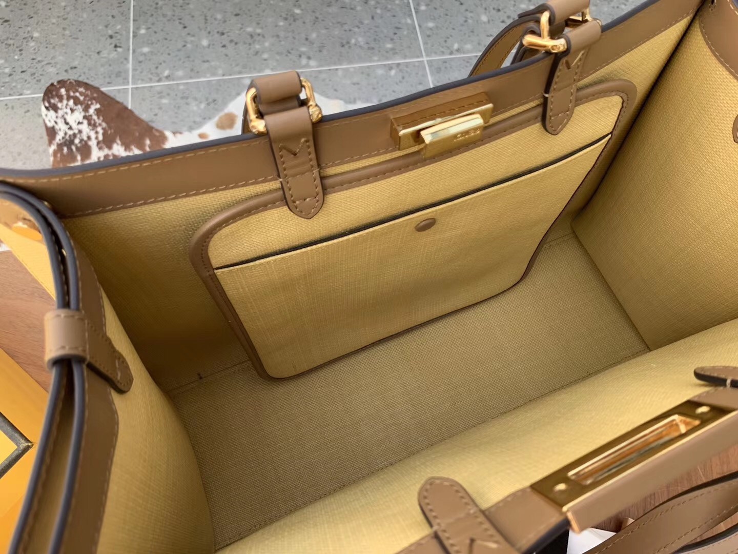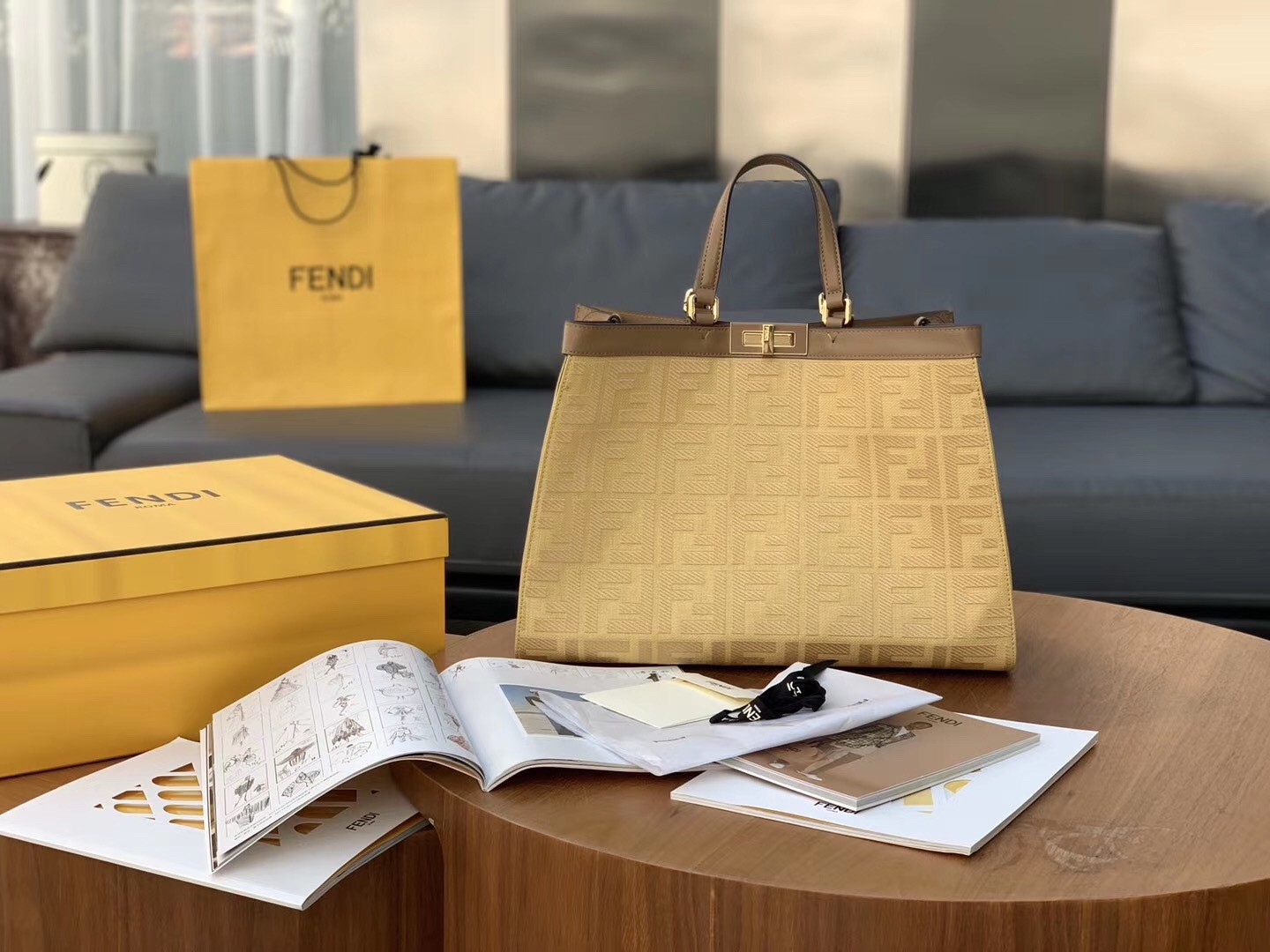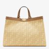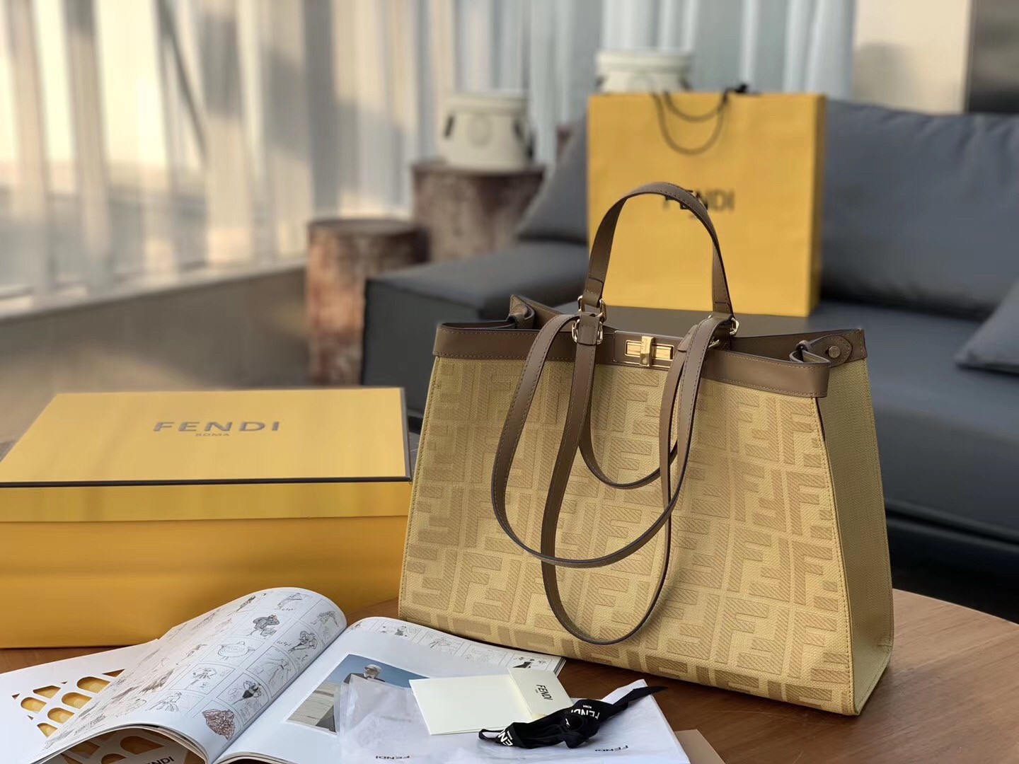 It’s designed in Canvas, refined with the double F logo all over the body. While the original Fendi Peekaboo Bag can lean forward, this Tote Bag cannot. The center does feature the iconic Peekaboo Lock. The leather strap can be used for hand carry, but it can also be sling on the shoulder. The interior comes with 1 extra pocket but the main compartment is huge.