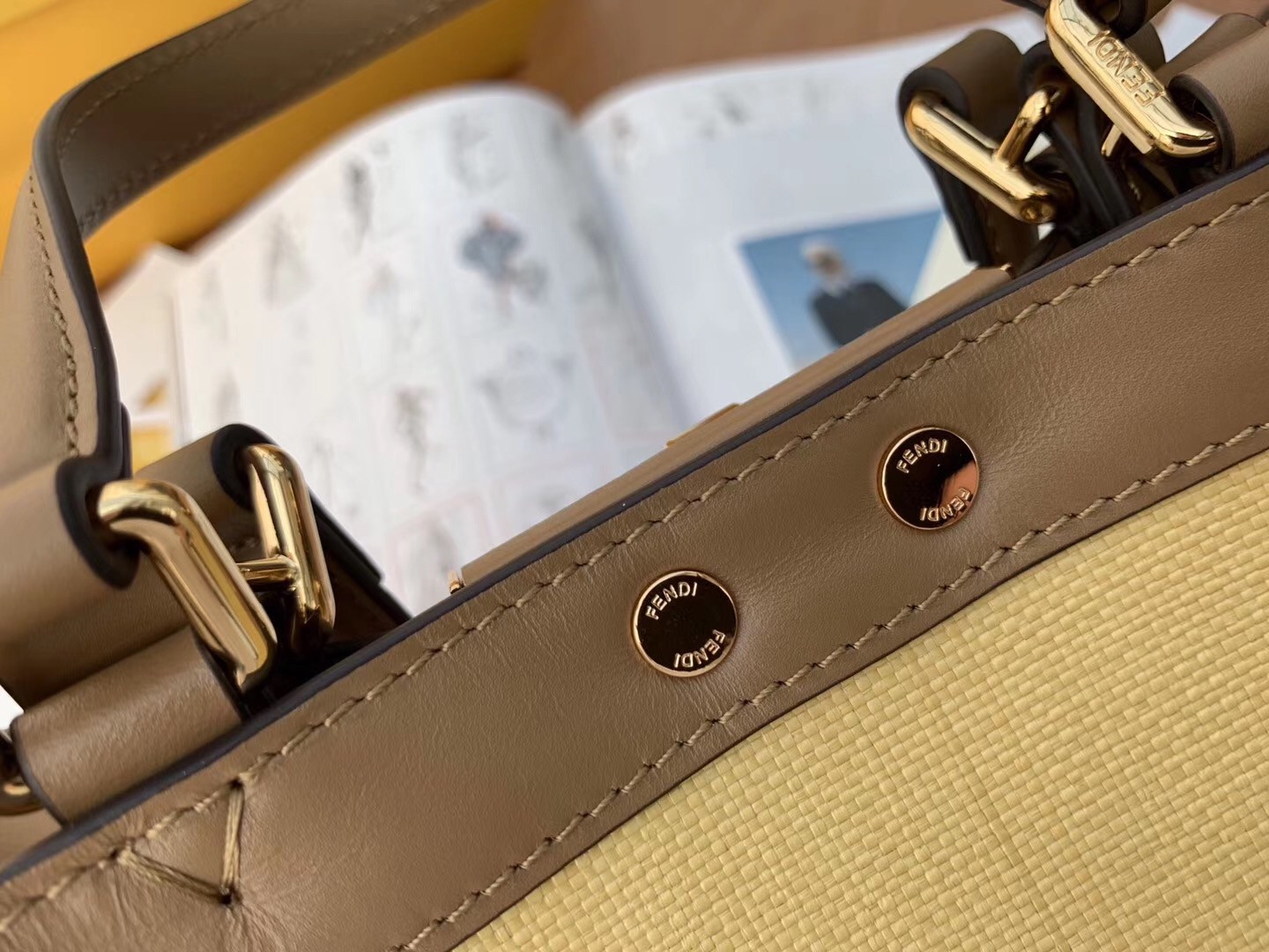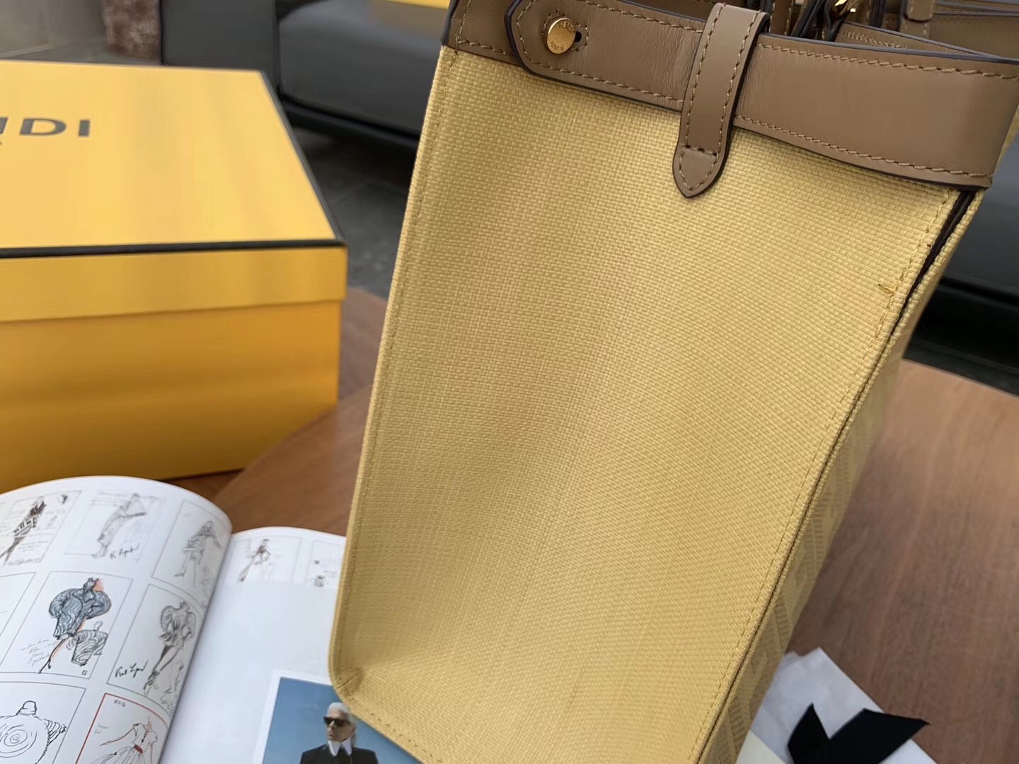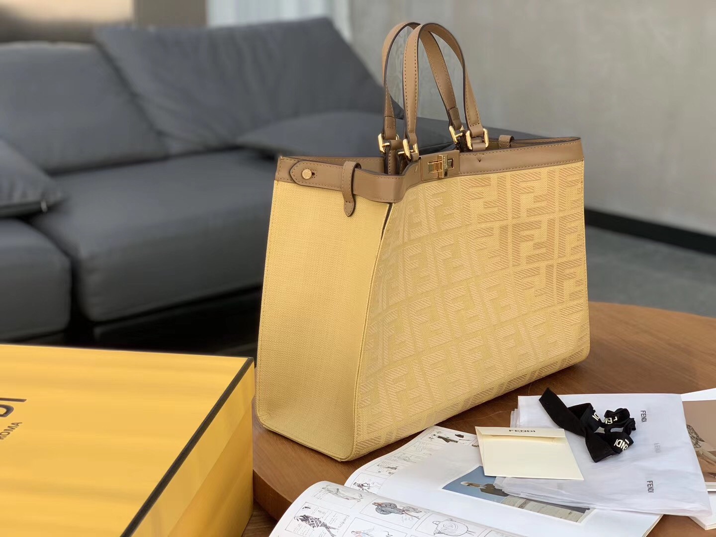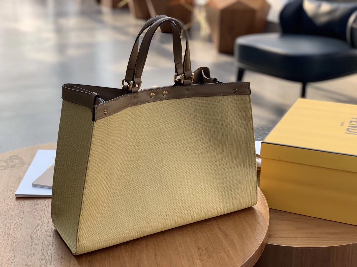 It’s designed in Canvas, refined with the double F logo all over the body. While the original Fendi Peekaboo Bag can lean forward, this Tote Bag cannot. The center does feature the iconic Peekaboo Lock. The leather strap can be used for hand carry, but it can also be sling on the shoulder. The interior comes with 1 extra pocket but the main compartment is huge.