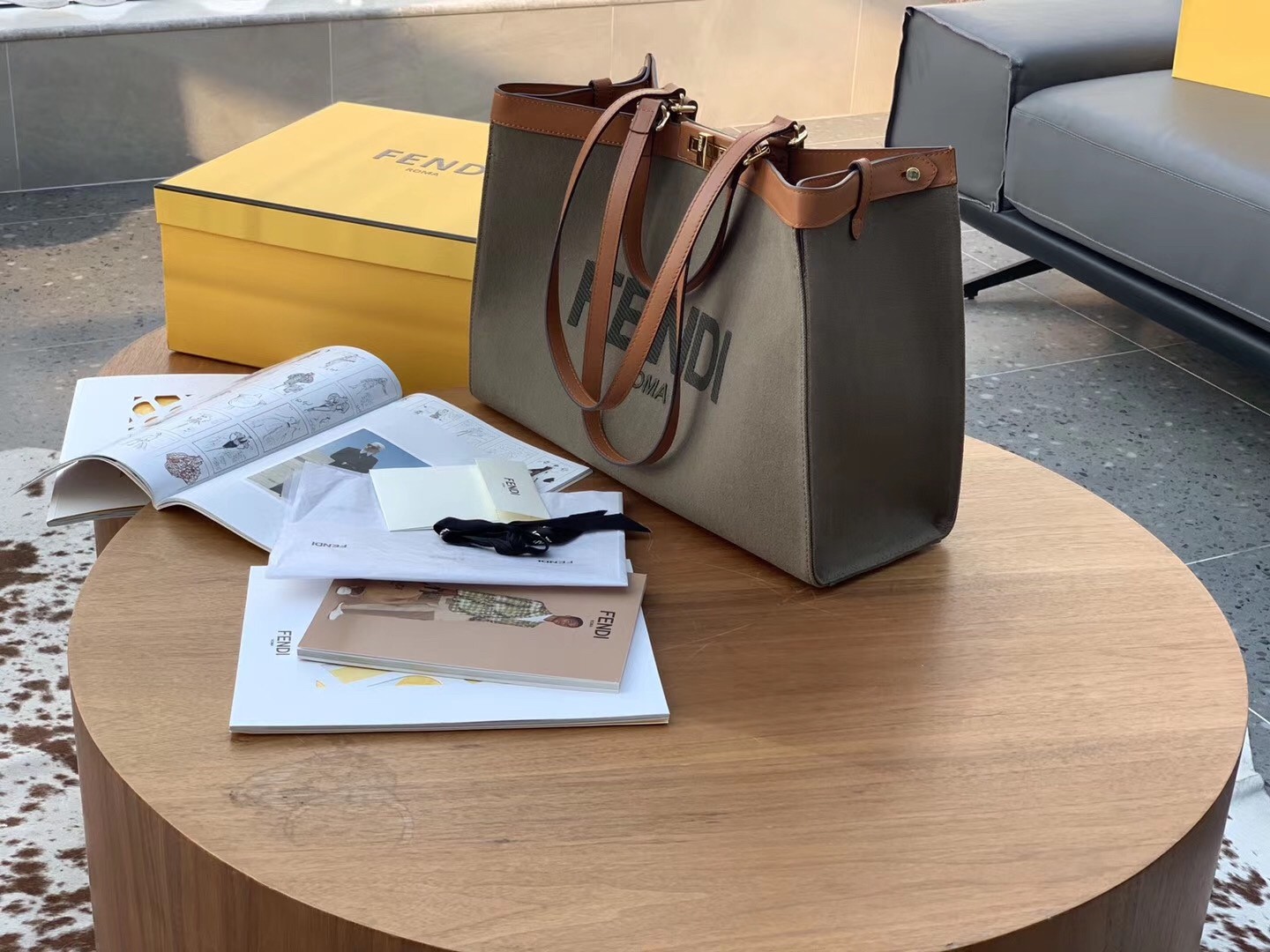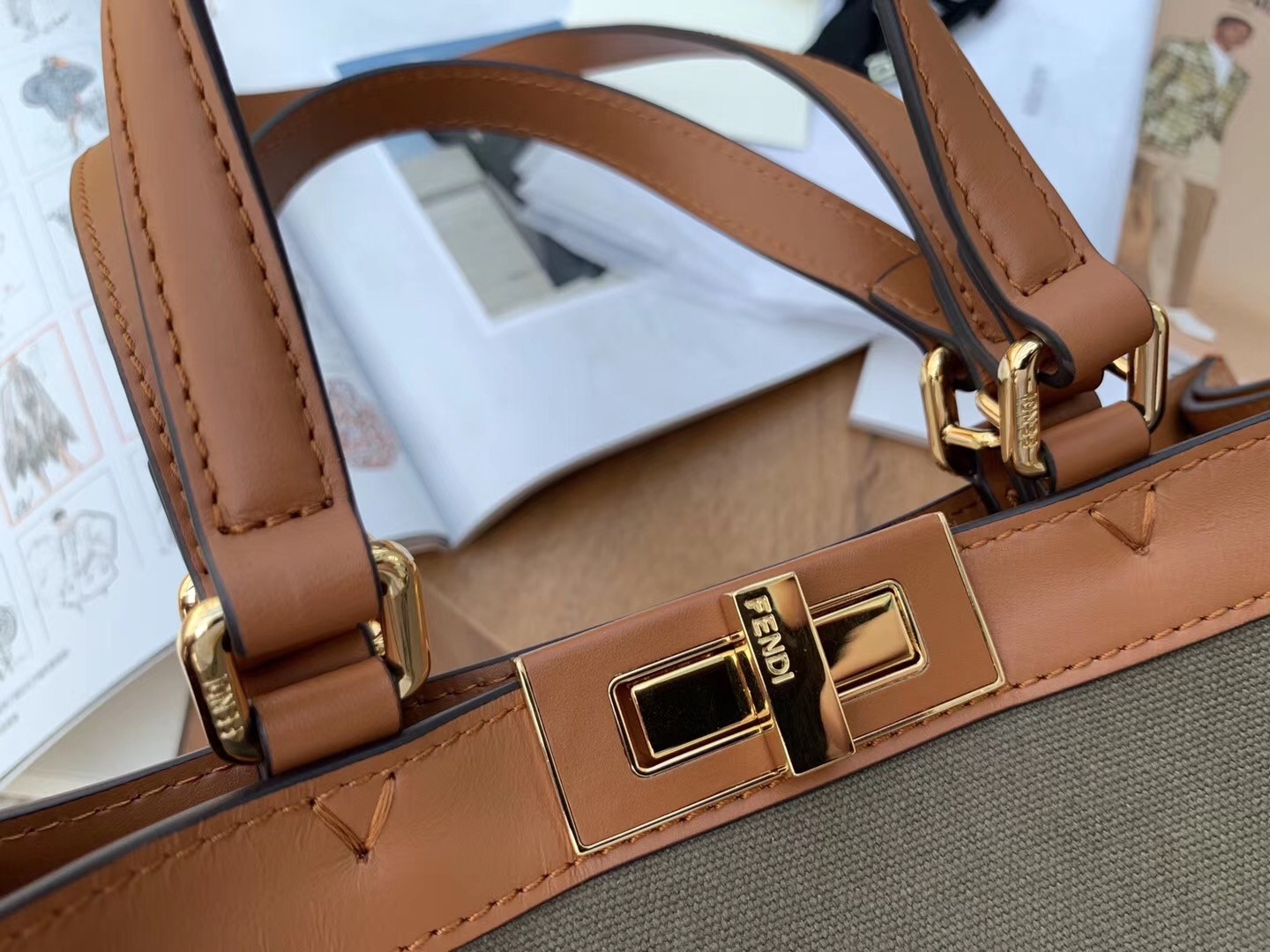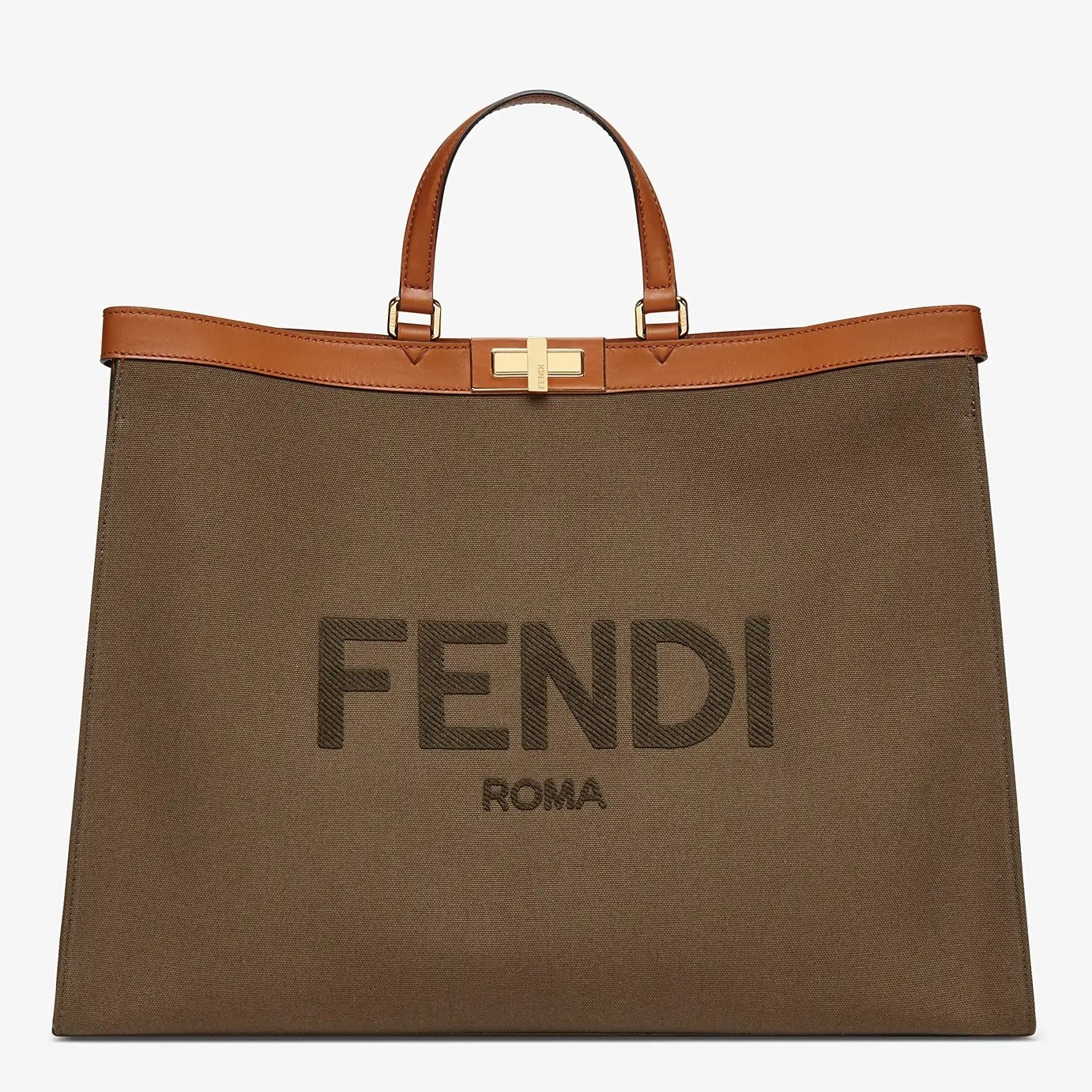 Large Peekaboo X-Tote in dark green canvas embroidered with tone on tone FENDI ROMA motif and contrasting brown leather trim. Interior leather pocket and the signature twist-lock. Gold-tone metalware. Two short handles for carrying in the hand and two long handles for wearing over the shoulder.