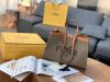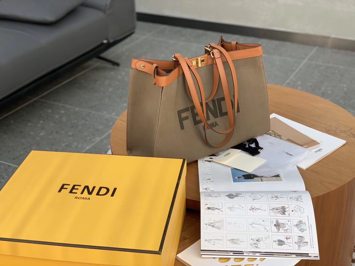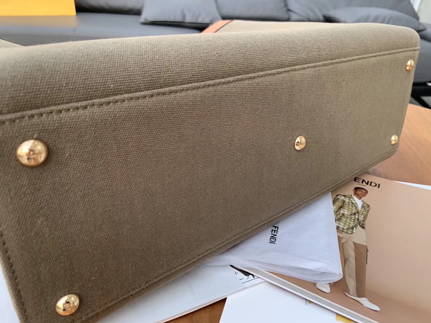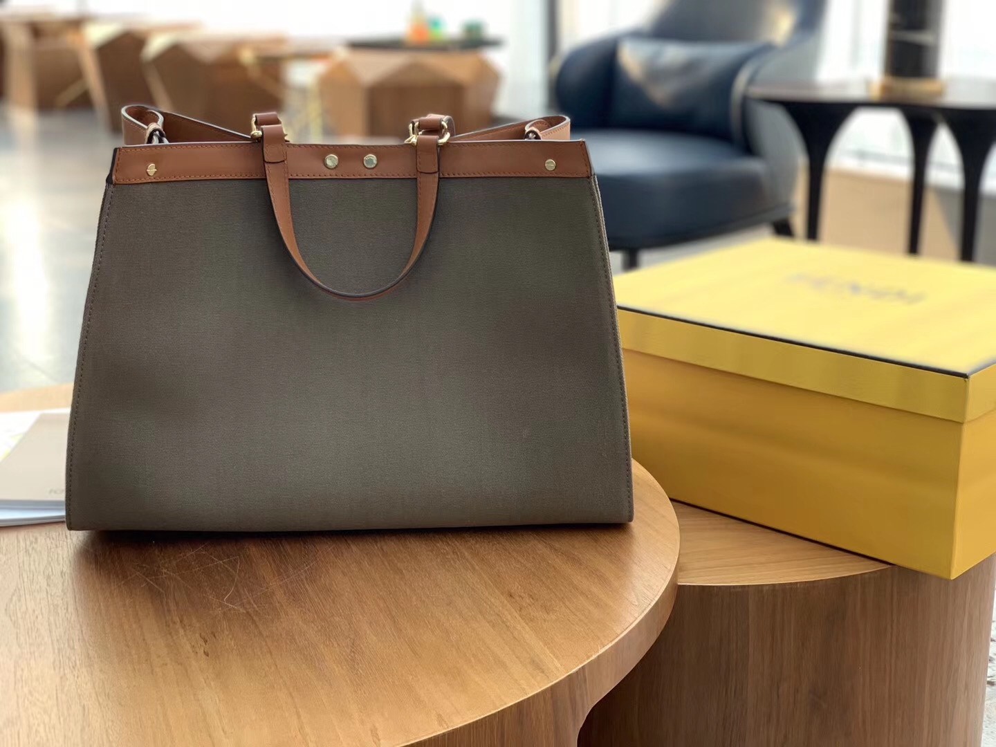 Large Peekaboo X-Tote in dark green canvas embroidered with tone on tone FENDI ROMA motif and contrasting brown leather trim. Interior leather pocket and the signature twist-lock. Gold-tone metalware. Two short handles for carrying in the hand and two long handles for wearing over the shoulder.