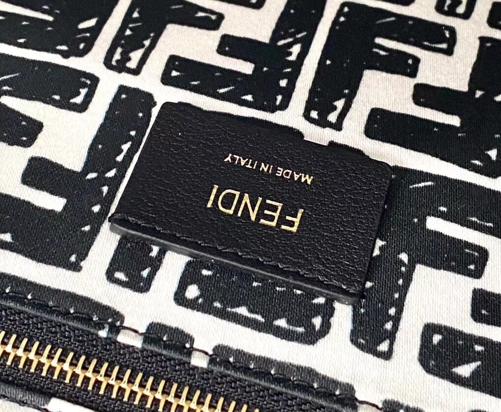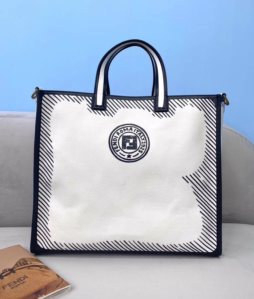 Shopper bag made of glazed, white fabric, decorated with edges and details marked by a contrasting graphic outline that gives a two dimensional effect and creates a black Fendi Stamp.Featuring a spacious internal compartment with FF motif, an inner zip pocket and gold-finish metalware. Can be carried by hand with the two handles, and two inner hooks allow you to attach a shoulder strap.