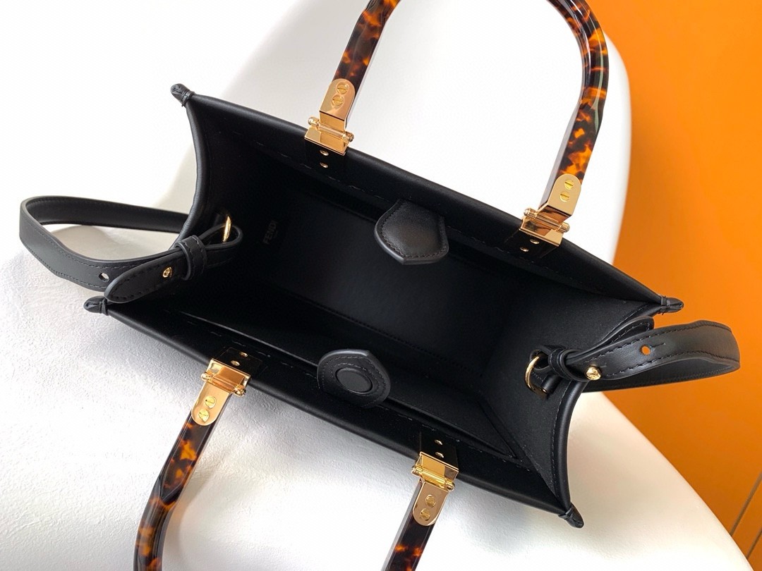 Fendi Small Sunshine Shopper bag made of smooth leather with hot-stamped FENDI ROMA lettering and stiff tortoiseshell plexiglass handles. Features a spacious lined internal compartment, edges in tone-on-tone leather, and gold-finish metalware.Can be carried by hand or worn on the shoulder thanks to the two handles and detachable shoulder strap.