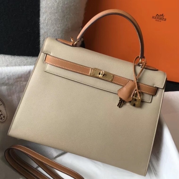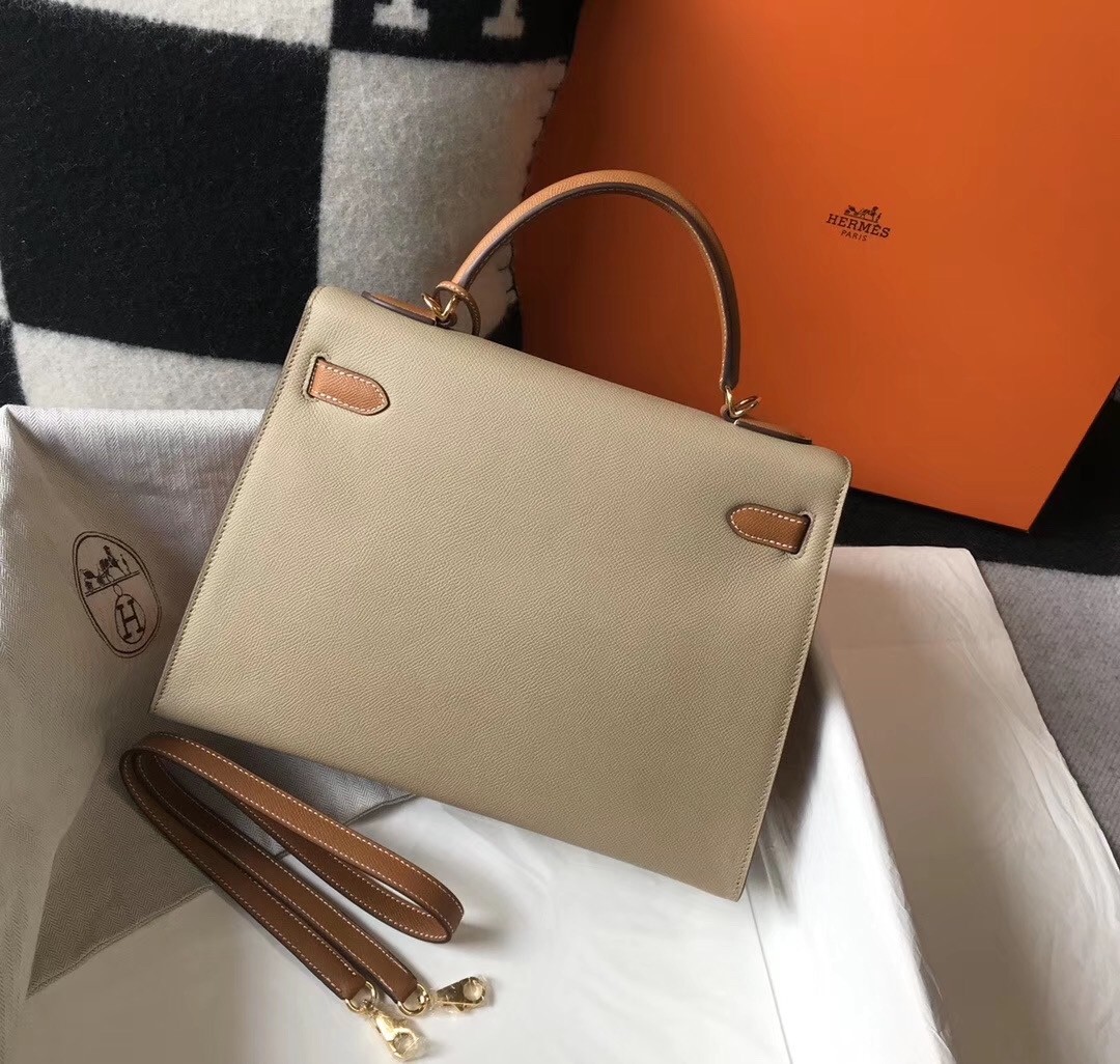 Be the first to review “Hermes Bi-color Kelly 32cm Epsom Bag Tourterelle/Gold GHW”