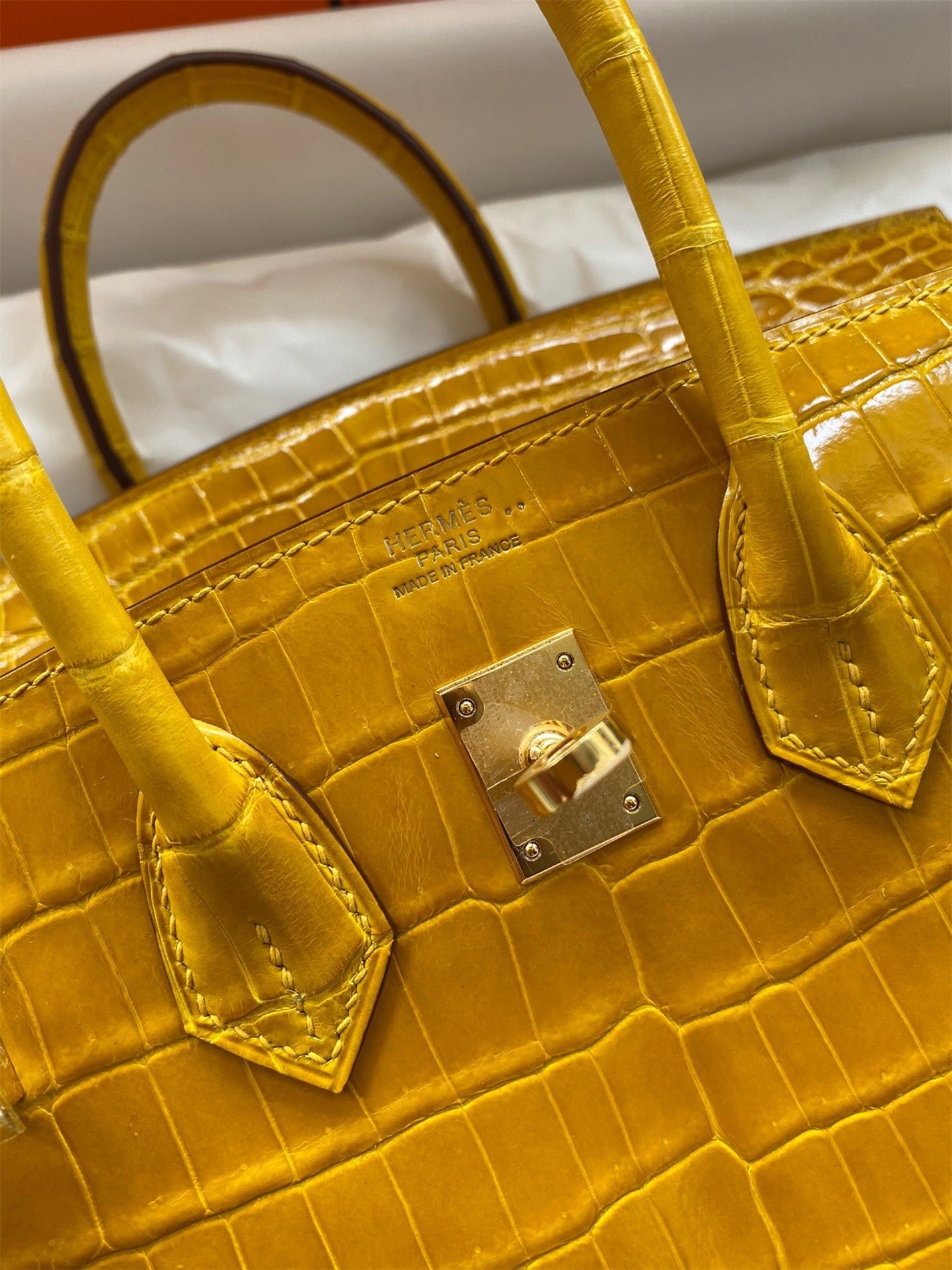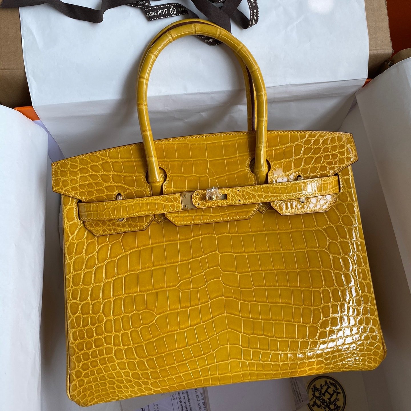 Hermes Birkin 30 Handmade Bag In Jaune Ambre Crocodile Niloticus Shiny Skin