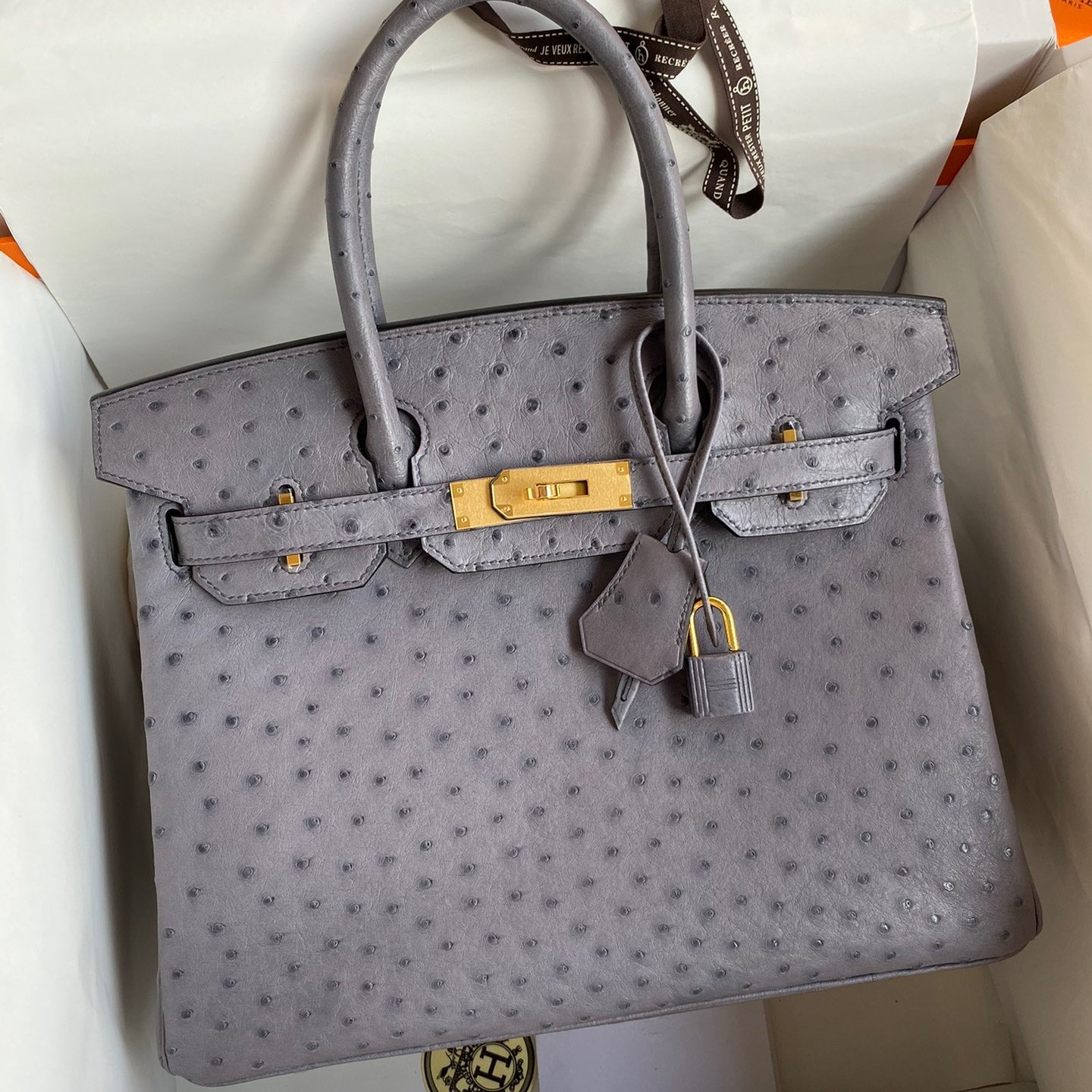 While Herm??s Birkin bags are considered the rarest and most desirable bags in the world, among Birkins, exotic examples are considered even more so. One example of rare exotic skins Herm??s uses to make Birkins is Ostrich, which features a unique pattern of dots made from the bird’s feathers. Herm??s produces Ostrich bags in few numbers, and takes special care when deciding which colors to use. This example, done in classic Gris Asphalt is an uncompromising neutral that is both subtle and striking, perfectly paired with Palladium hardware. This bag has been used lovingly and gently.