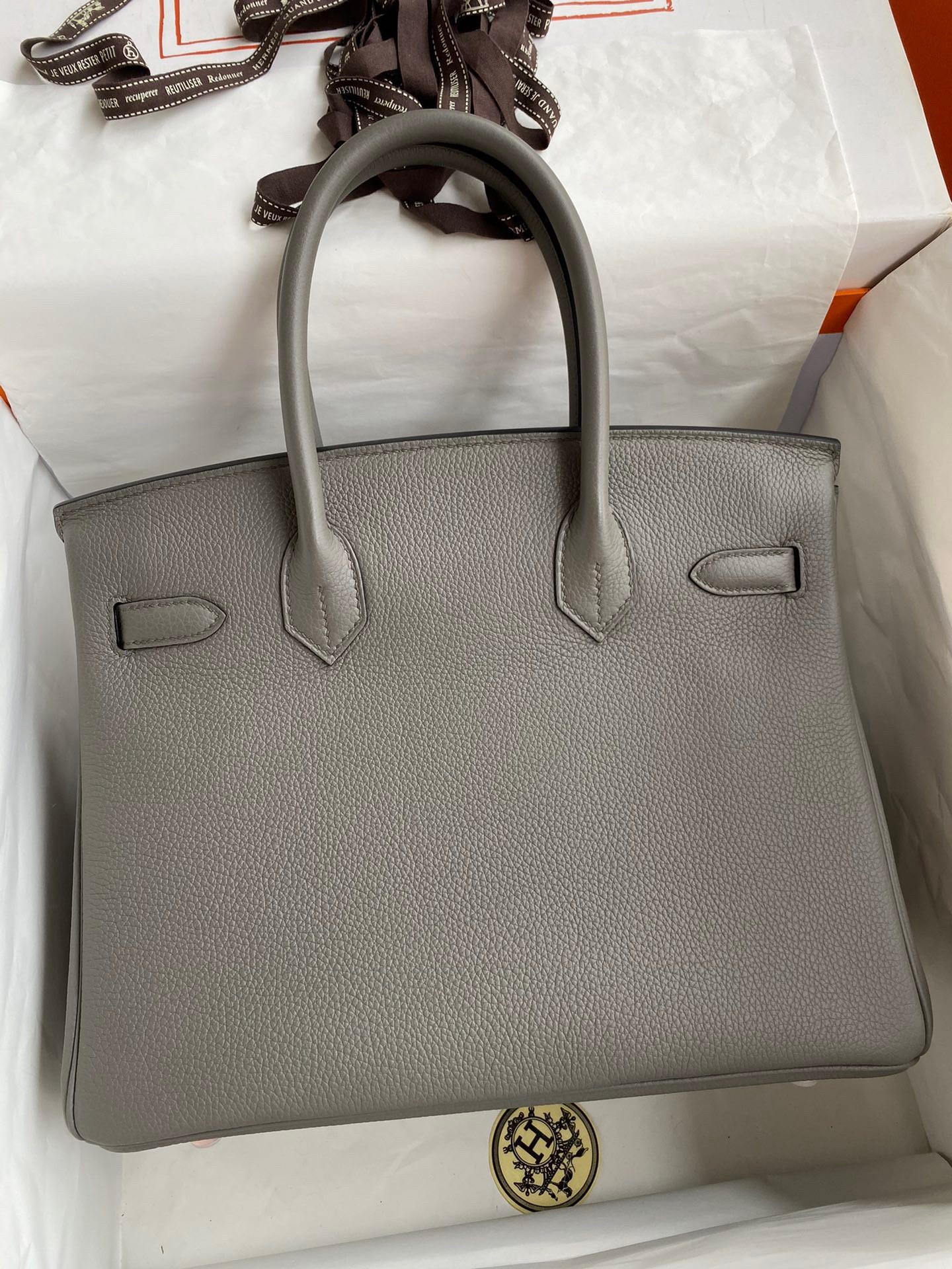 The original Herm??s Birkin bag was inspired by and named after 60’s fashion icon Jane Birkin. It was designed to be a luxury bag that would meet the needs and stand up to daily use by a multitasking woman on the go. The Birkin 30 is the Goldilocks of the Birkin bag family, It is the ideal Herm??s bag for everyday use. Created in Retourne style, thanks to the taurillon Clemence leather gives this bag the buttery soft feel that only comes from the highest quality leather.