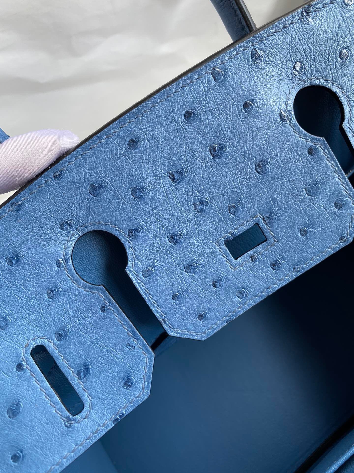 While Herm??s Birkin bags are considered the rarest and most desirable bags in the world, among Birkins, exotic examples are considered even more so. One example of rare exotic skins Herm??s uses to make Birkins is Ostrich, which features a unique pattern of dots made from the bird’s feathers. Herm??s produces Ostrich bags in few numbers, and takes special care when deciding which colors to use. This example, done in classic Mykonos is an uncompromising neutral that is both subtle and striking, perfectly paired with Palladium hardware. This bag has been used lovingly and gently.