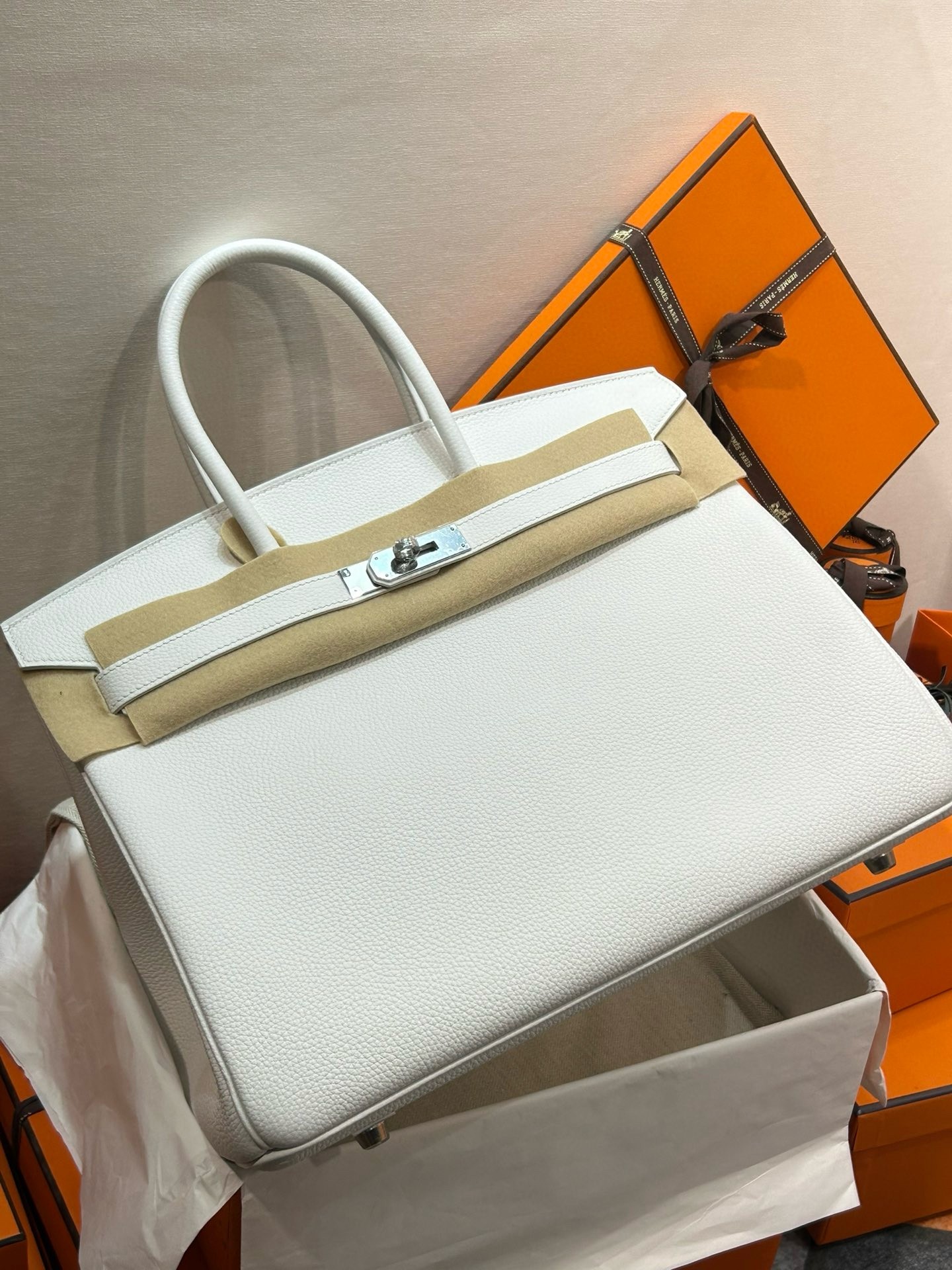 The Herm??s Birkin 35cm is the original Birkin bag and in even greater demand now than when it was one of the original ??It Bags.?? Inspired by and named for fashion icon Jane Birkin, the Birkin 35 was designed to answer the needs of a busy, multi-tasking woman on the go. Created in Retourne style, which features inside stitching, lending a more relaxed look to the bag. Handcrafted from Taurillon Clemence leather, which named in tribute to the daughter of the designer who introduced it into the collections. A spacious carryall, the Birkin 35 is an ideal travel bag and doubles as a feminine briefcase.