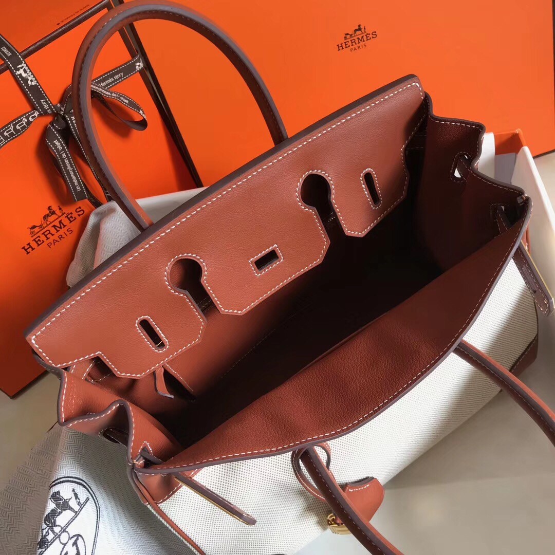 In 1984 the Hermes Birkin Bag was born. Beginning as a supple leather bag for actress and singer Jane Birkin, the bag quickly rose in popularity and is now the symbol of wealth, class, and fashion. It’s highly recognizable design makes it a staple of the fashion industry. This 35 cm features a mixture of Barenia leather in dark brown and Toile H canvas that provides to its figure the stiffness of its silhouette.