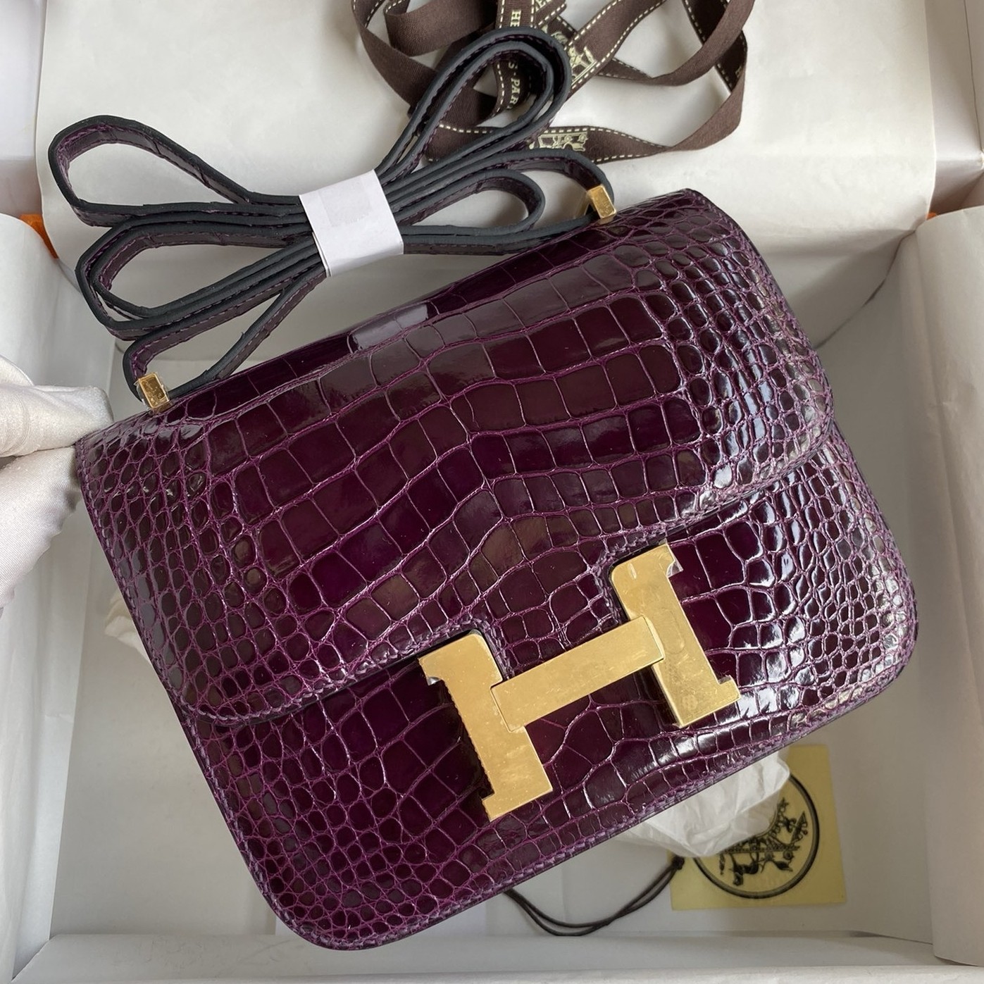 Introduced in 1969, the Herm??s Constance quickly became one of the most highly sought-after of the brand’s luxury bags, behind only the Kelly bag and the Birkin. The Herm??s Constance 18 is a stylish shoulder bag designed with versatility in mind. The Constance 18, also referred to as the Herm??s Constance Mini. The squarish shape and large, prominent ??H?? closure across the front give this bag a youthful appeal, even when rendered in a sophisticated Shiny Alligator skin. A skin that comes from the Mississippi Alligator, this leather is created by polishing the spots with agate for a Shiny finish.