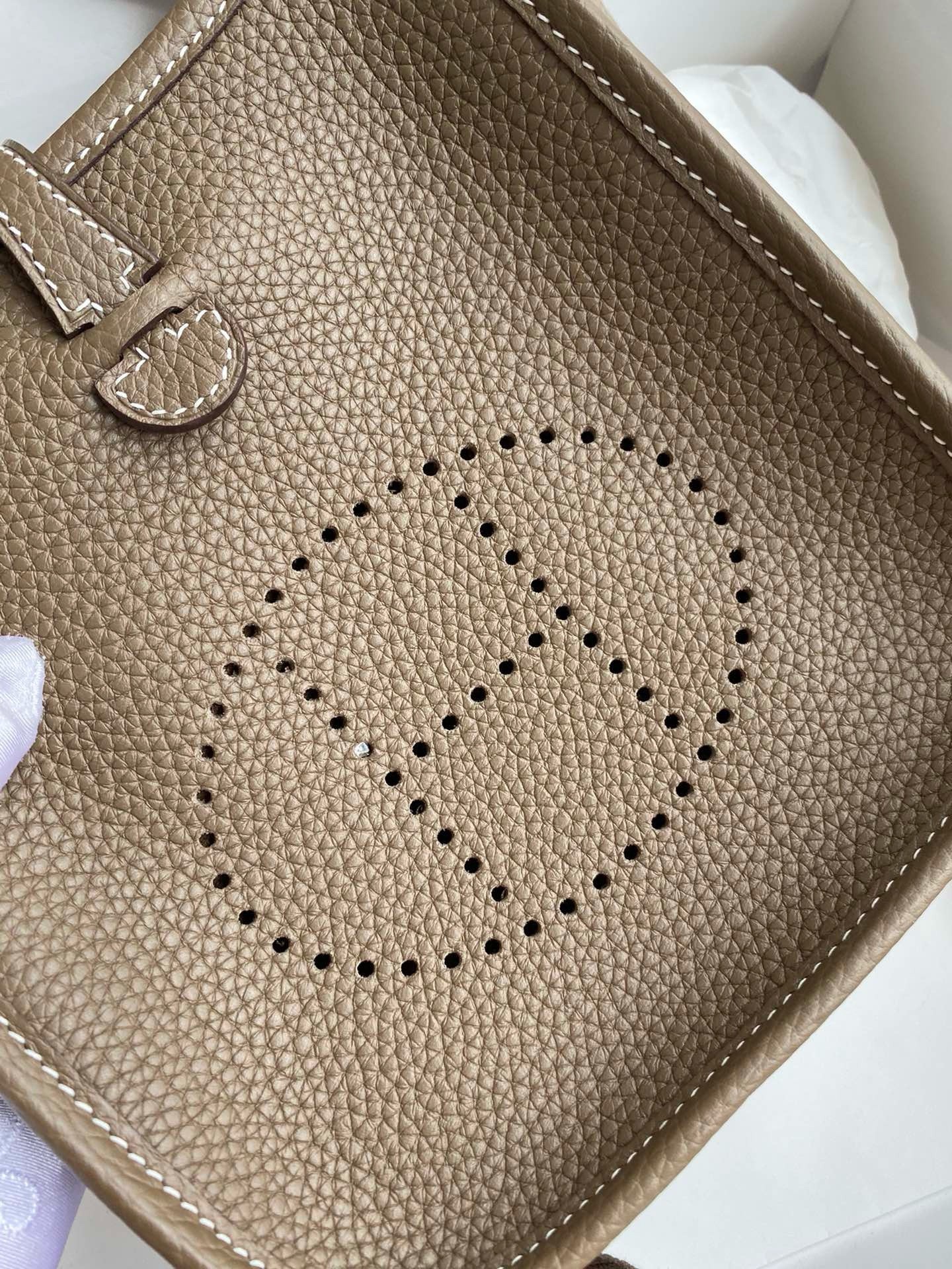 Be the first to review “Hermes Evelyne Mini Handmade Bag in Taupe Clemence Leather”