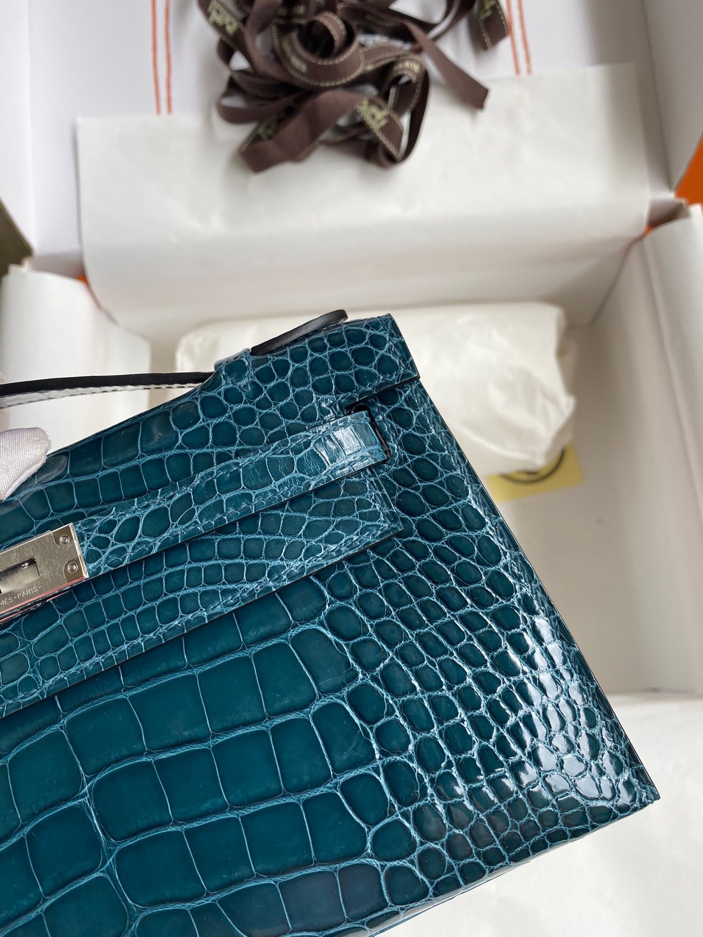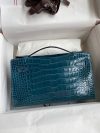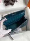 The Kelly Pochette was Jean-Paul Gaultier’s clutch interpretation of the classic Kelly bag. Introduced on the fall runway of his first collection for the House in 2004, the Kelly Pochette was an instant hit. This handbag is made from exotic Shiny Alligator skin with a Lisse finish, not to be confused with crocodile, alligator tends to be sourced from Florida in the United States and its scales tend to be more patterned than crocodile. Delicate and very expensive, this clutch is a stunning example of how Herm??s can improve even on what seems perfect.