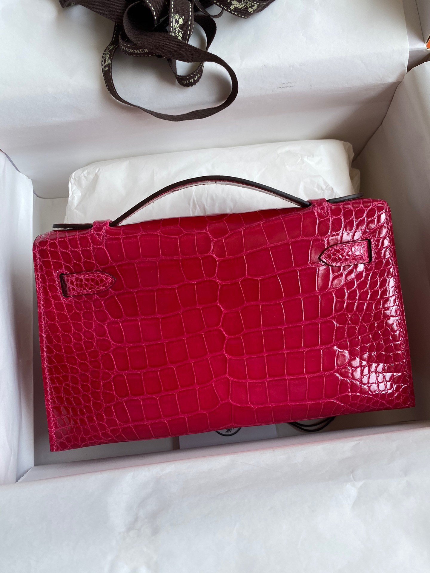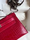 The Kelly Pochette was Jean-Paul Gaultier’s clutch interpretation of the classic Kelly bag. Introduced on the fall runway of his first collection for the House in 2004, the Kelly Pochette was an instant hit. This handbag is made from exotic Shiny Alligator skin with a Lisse finish, not to be confused with crocodile, alligator tends to be sourced from Florida in the United States and its scales tend to be more patterned than crocodile. Delicate and very expensive, this clutch is a stunning example of how Herm??s can improve even on what seems perfect.