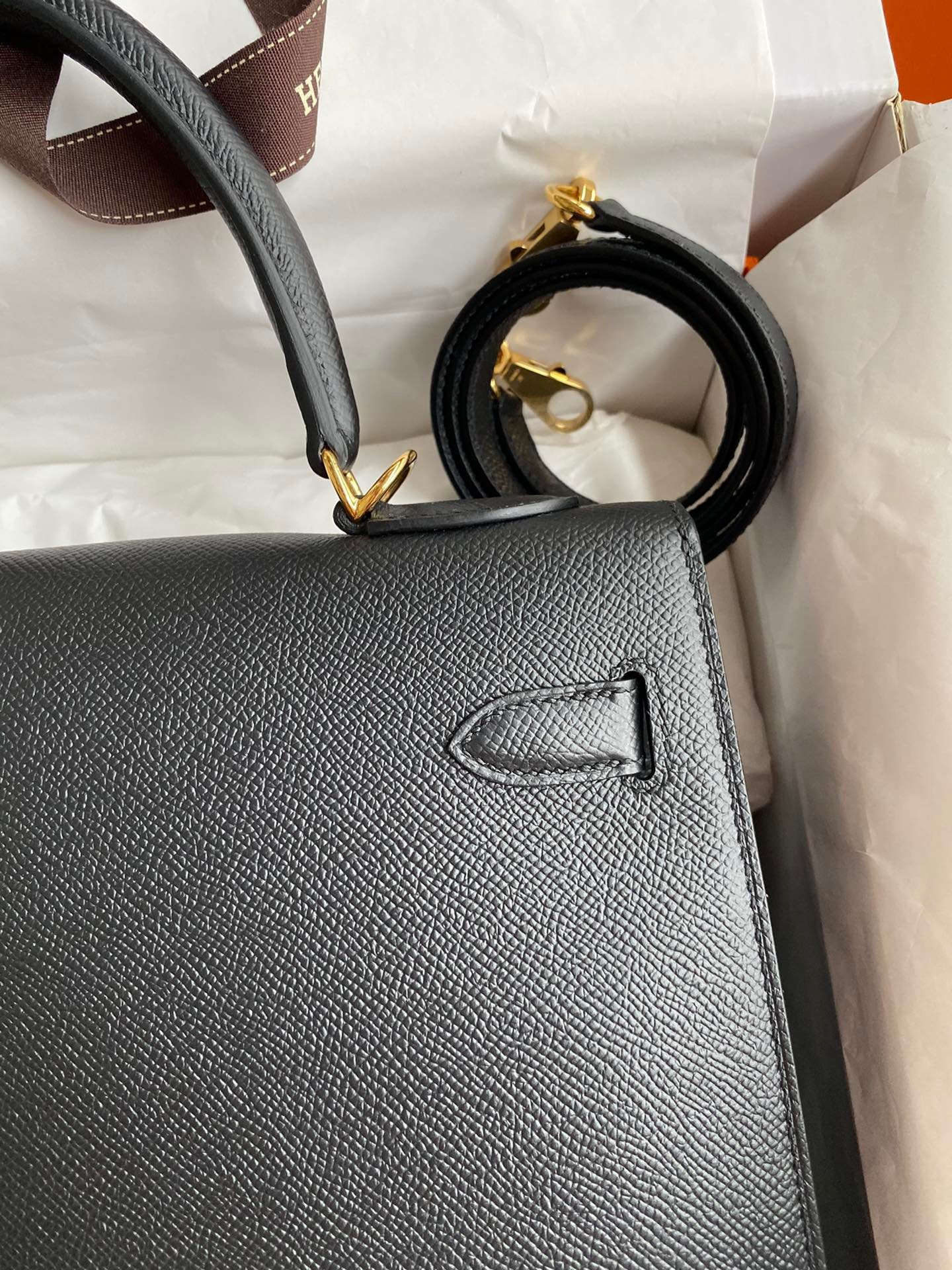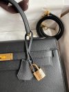 The iconic trapezoid shape of the Hermes Kelly 32 was a striking departure from the ornate handbag styles of the day. The chic look took the world by storm when legendary actress, and crowned princess of Monaco, Grace Kelly was photographed holding her Herm??s Sac ?? D??p??ches bag to shield her baby bump from the paparazzi. This Kelly 32 bag in Sellier, a rigid style made by stitching the sides of the bag on the outside, thanks to the Epsom calfskin. It is an ideal daily bag for the busy woman on the go. It is spacious enough to carry all your everyday essentials.