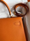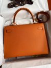 The iconic trapezoid shape of the Hermes Kelly 32 was a striking departure from the ornate handbag styles of the day. The chic look took the world by storm when legendary actress, and crowned princess of Monaco, Grace Kelly was photographed holding her Herm??s Sac ?? D??p??ches bag to shield her baby bump from the paparazzi. This Kelly 32 bag in Sellier, a rigid style made by stitching the sides of the bag on the outside, thanks to the Epsom calfskin. It is an ideal daily bag for the busy woman on the go. It is spacious enough to carry all your everyday essentials.