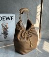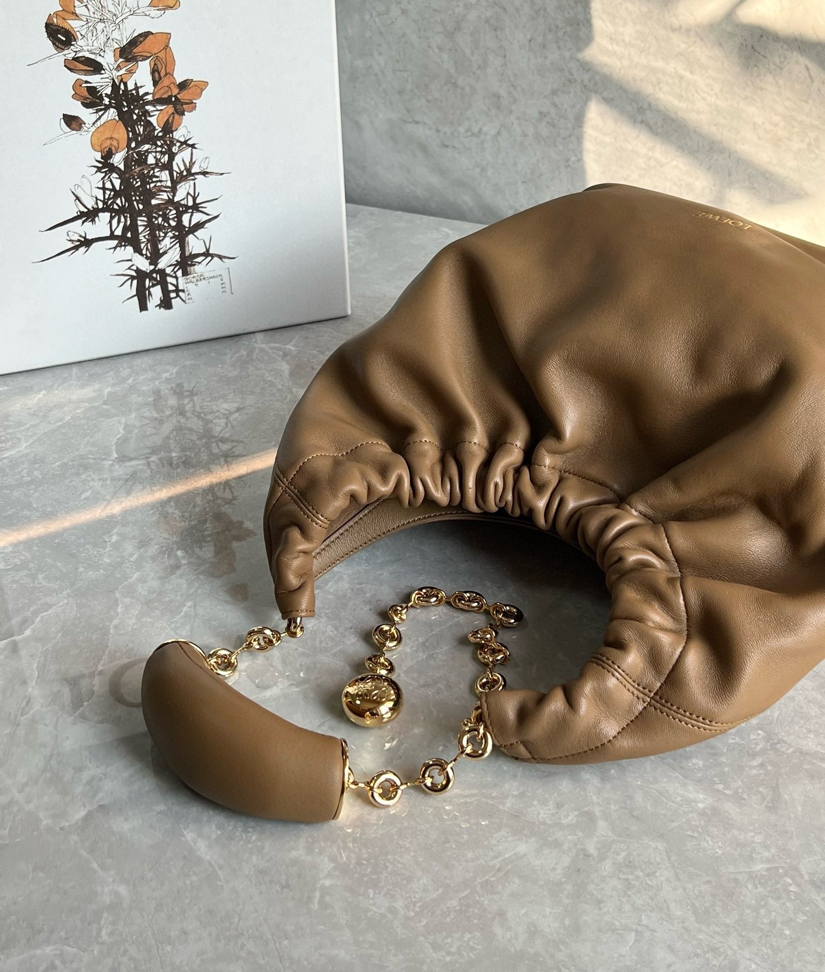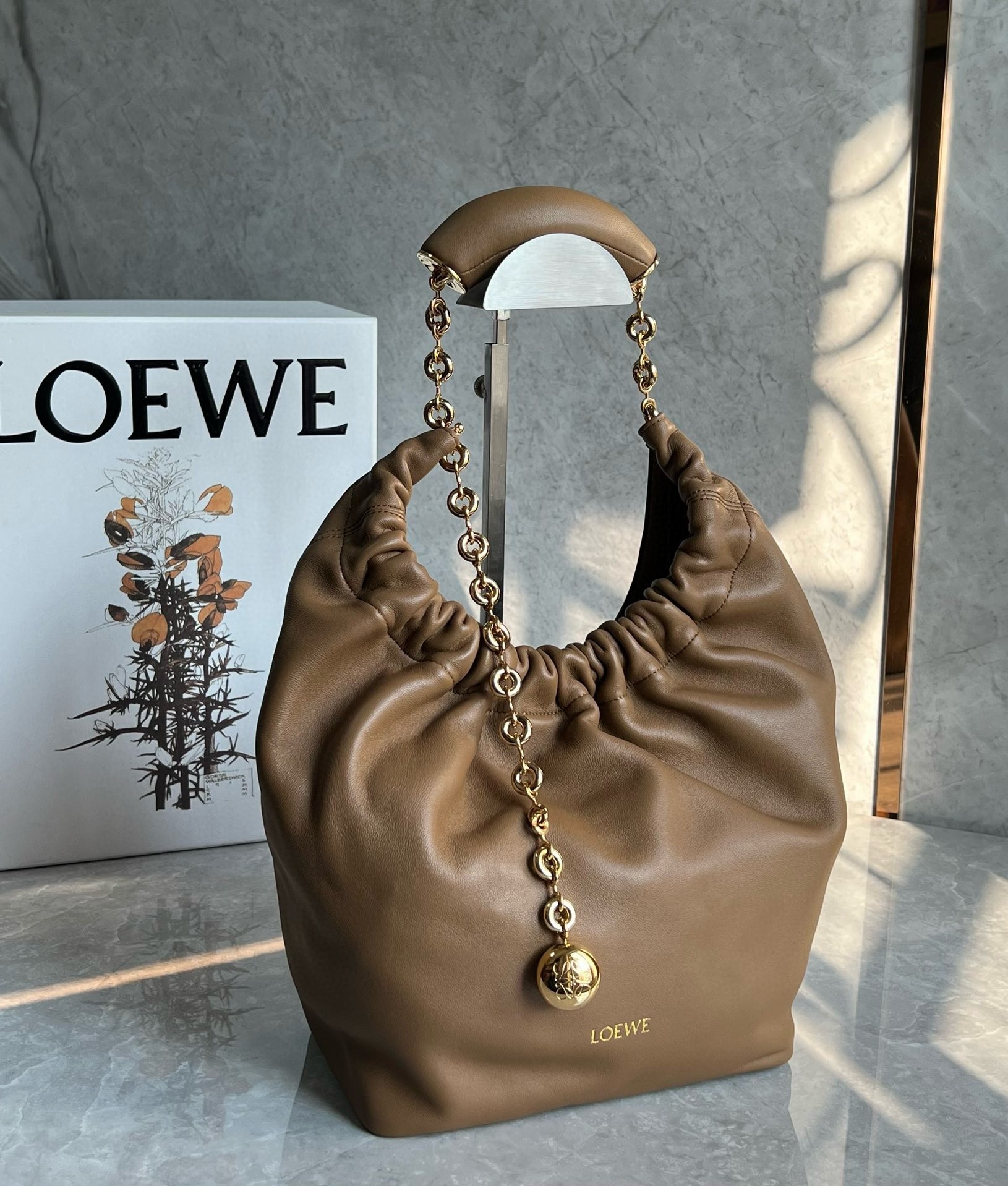 For the Autumn/Winter 2023 collection, LOEWE introduces the new Squeeze silhouette, so named because of its characteristic squishy handle, combines artistic design with fine craftsmanship. Crafted from nappa lambskin and gathered along a doughnut-shaped handle for a design that looks squishy and malleable to touch. A swinging ball chain creates glamorous dynamism, with a puffy leather-coated handle for comfort.
