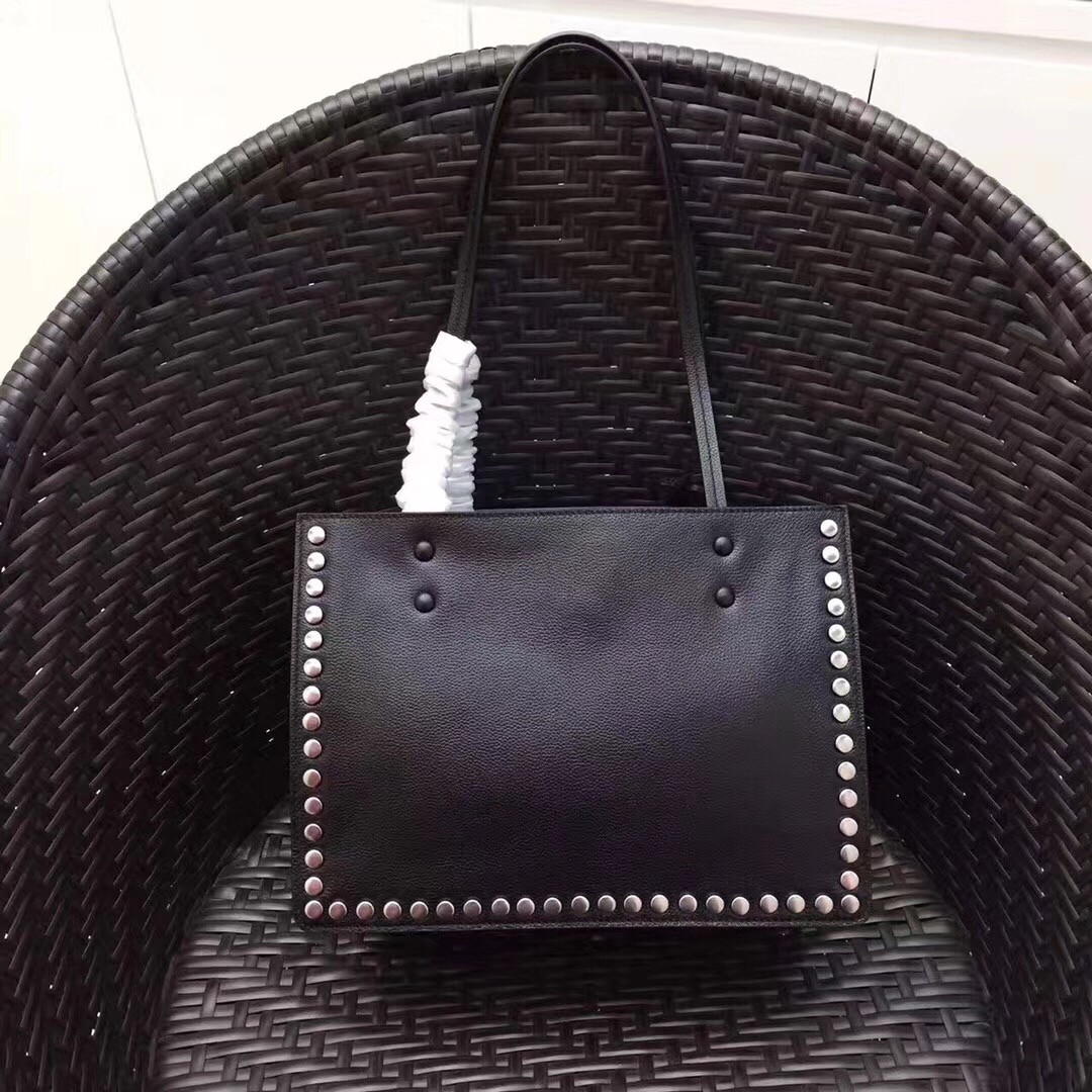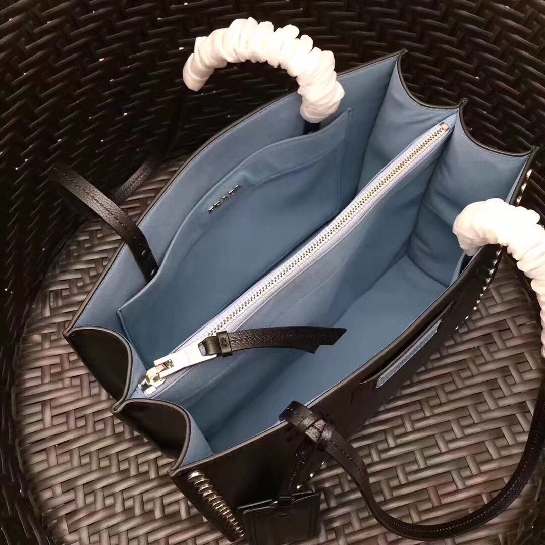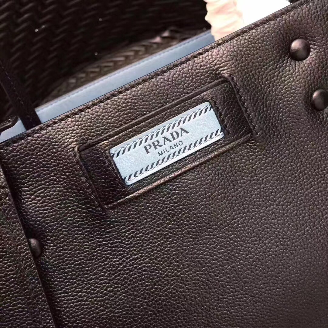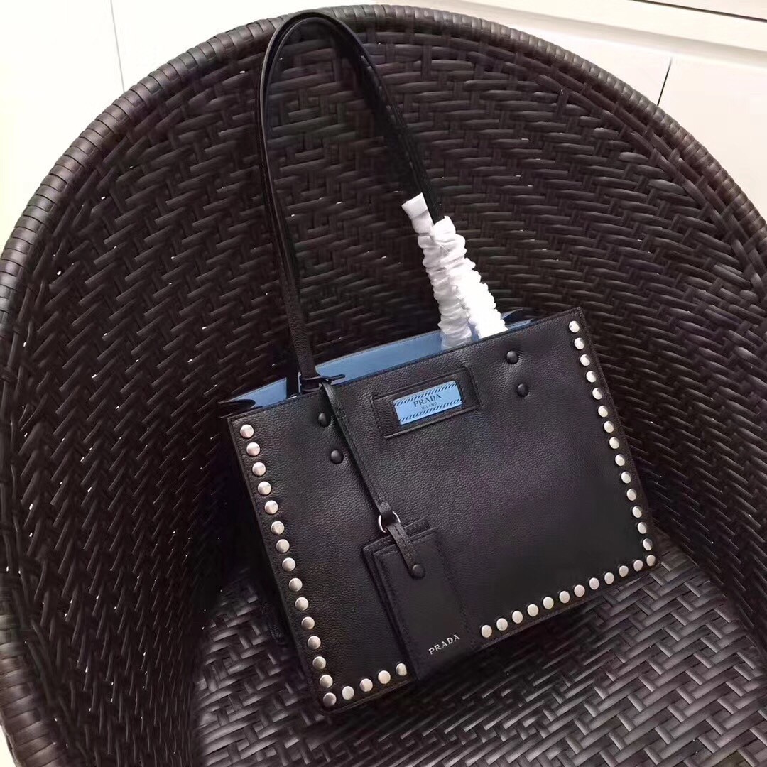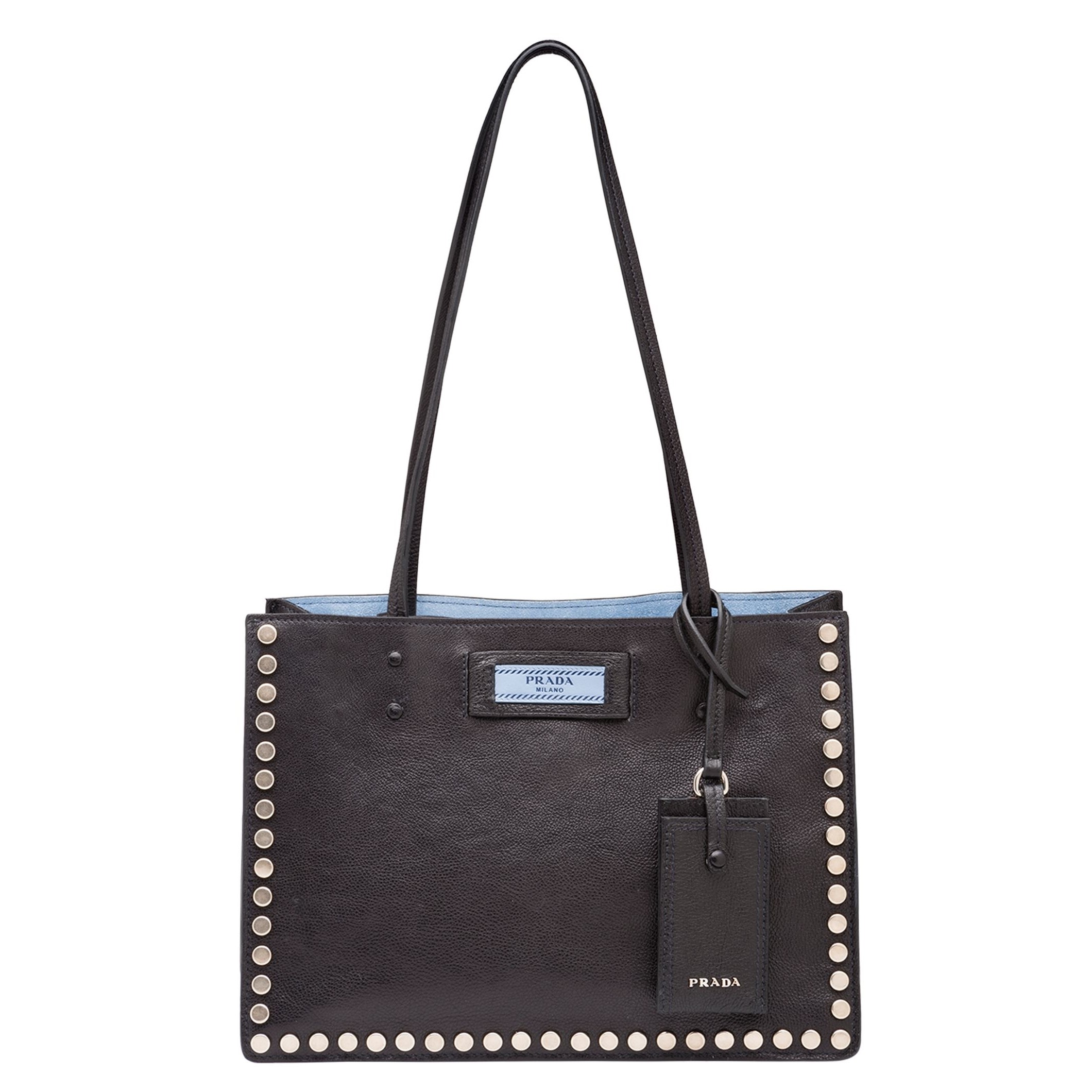 A Prada Etiquette tote contoured with a line of studs. The Prada Etiquette logo in a contrasting shade enlivens the monotone calf leather while the color-rich inside is divided into three pockets.