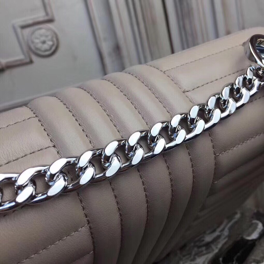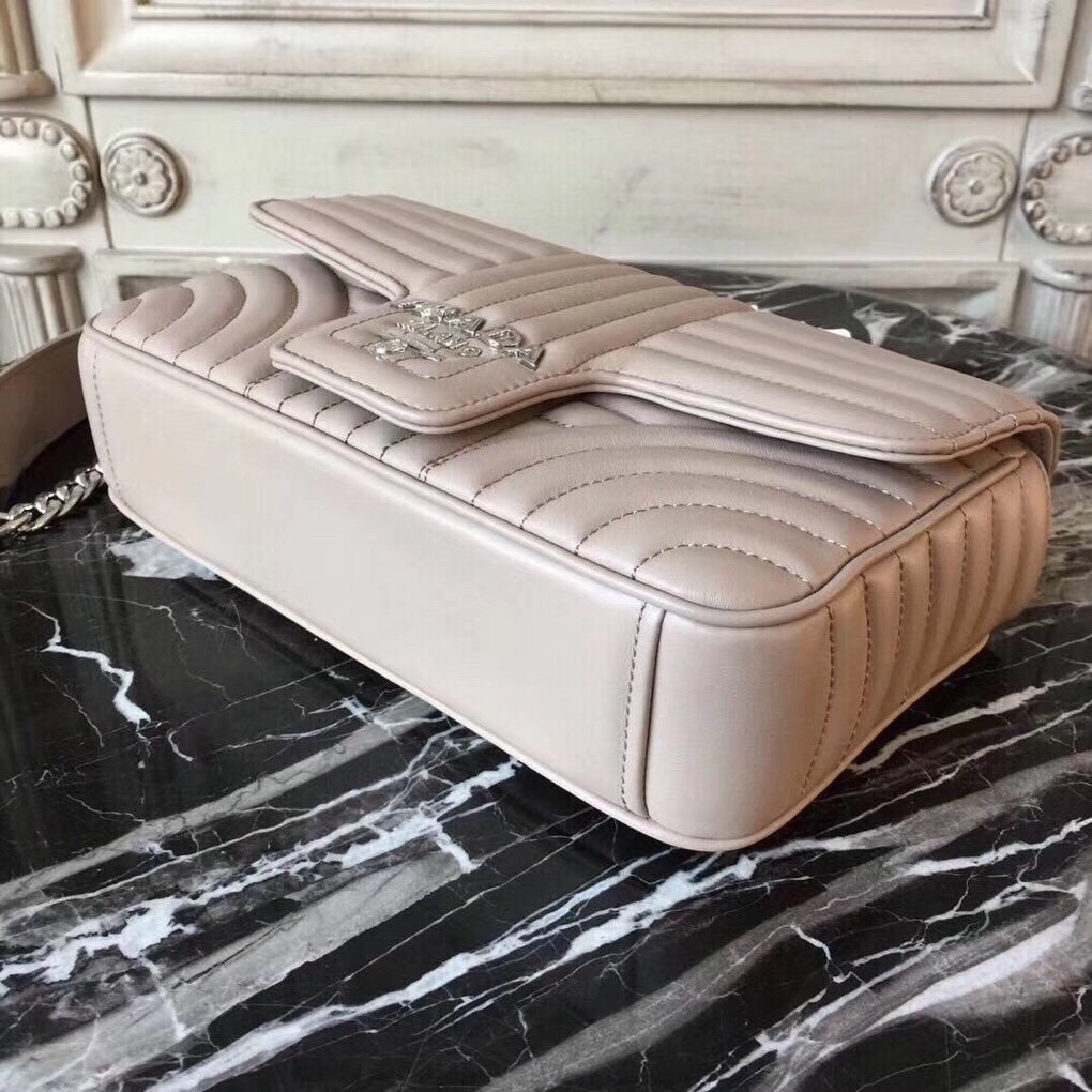 Prada has invented a complete new type of quilting. It looks modern but very sophisticated. The flap has a nose-like design and the center is crafted with the new Prada logo. This handbag is the house*s latest design and it looks like it will pave its way to the iconic status. Comes with a long chain strap for shoulder and cross body carry. The durable calfskin leather makes sure you can be fashionable without the need to baby this bag.