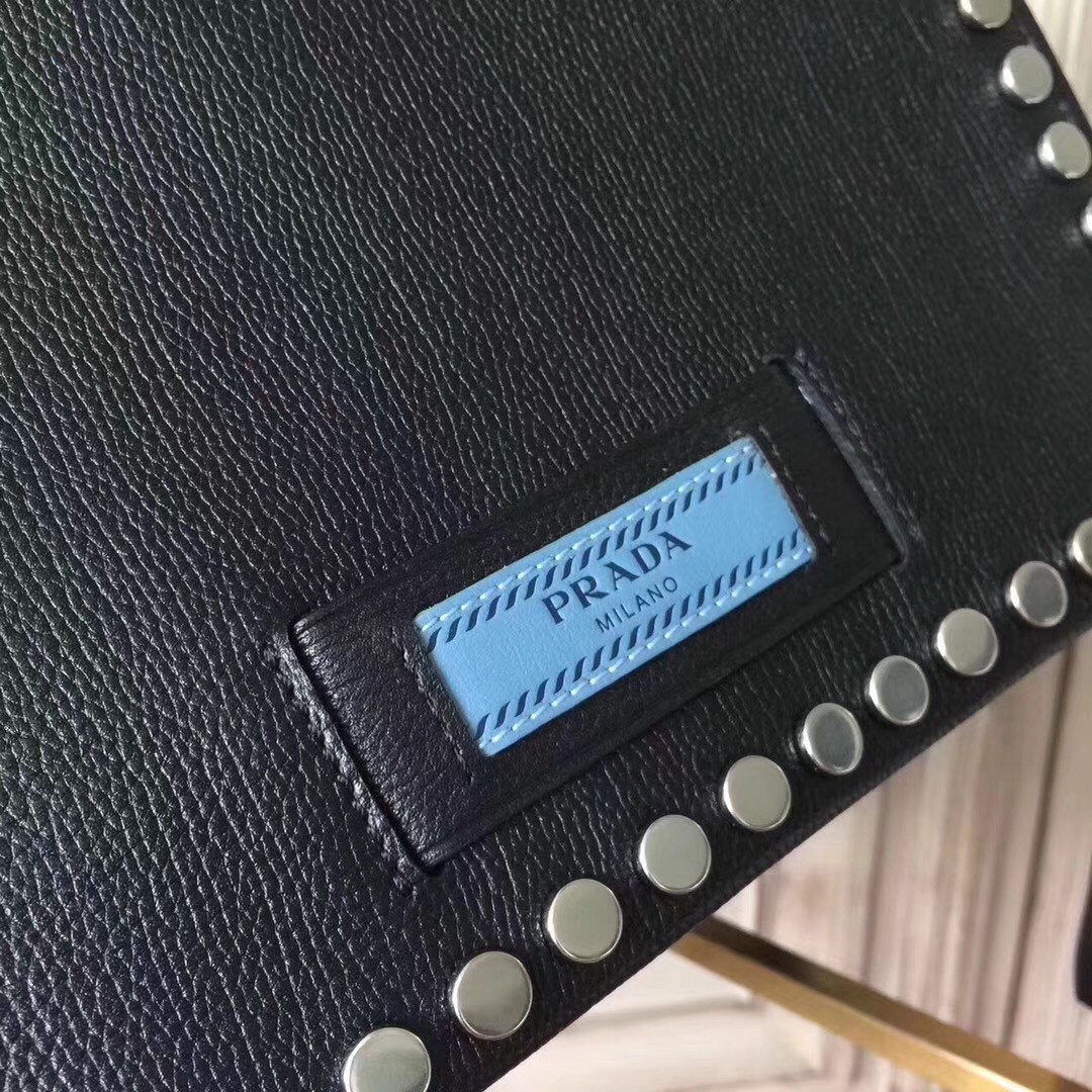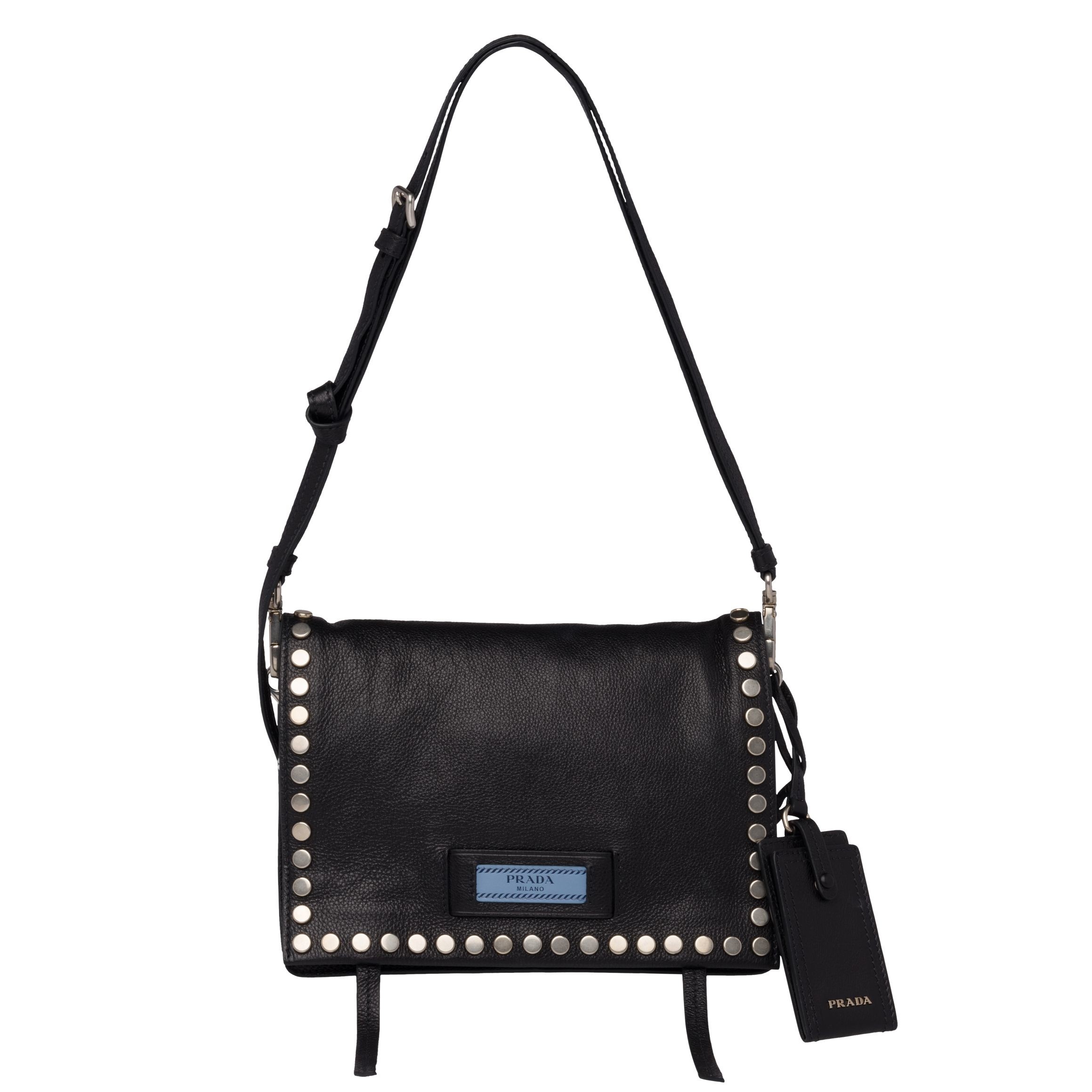 Specialist in leather goods since 1913, Prada has an incredible capacity for renewal, as the Prada Etiquette studded shoulder bag proves. With its supple leather and refined studs, this shoulder bag embodies a modern, relaxed elegance. Prada embellishes this bag with its historic logo on a new tag. The name of the brand is also inscribed in metal letters on the iconic leather luggage tag.