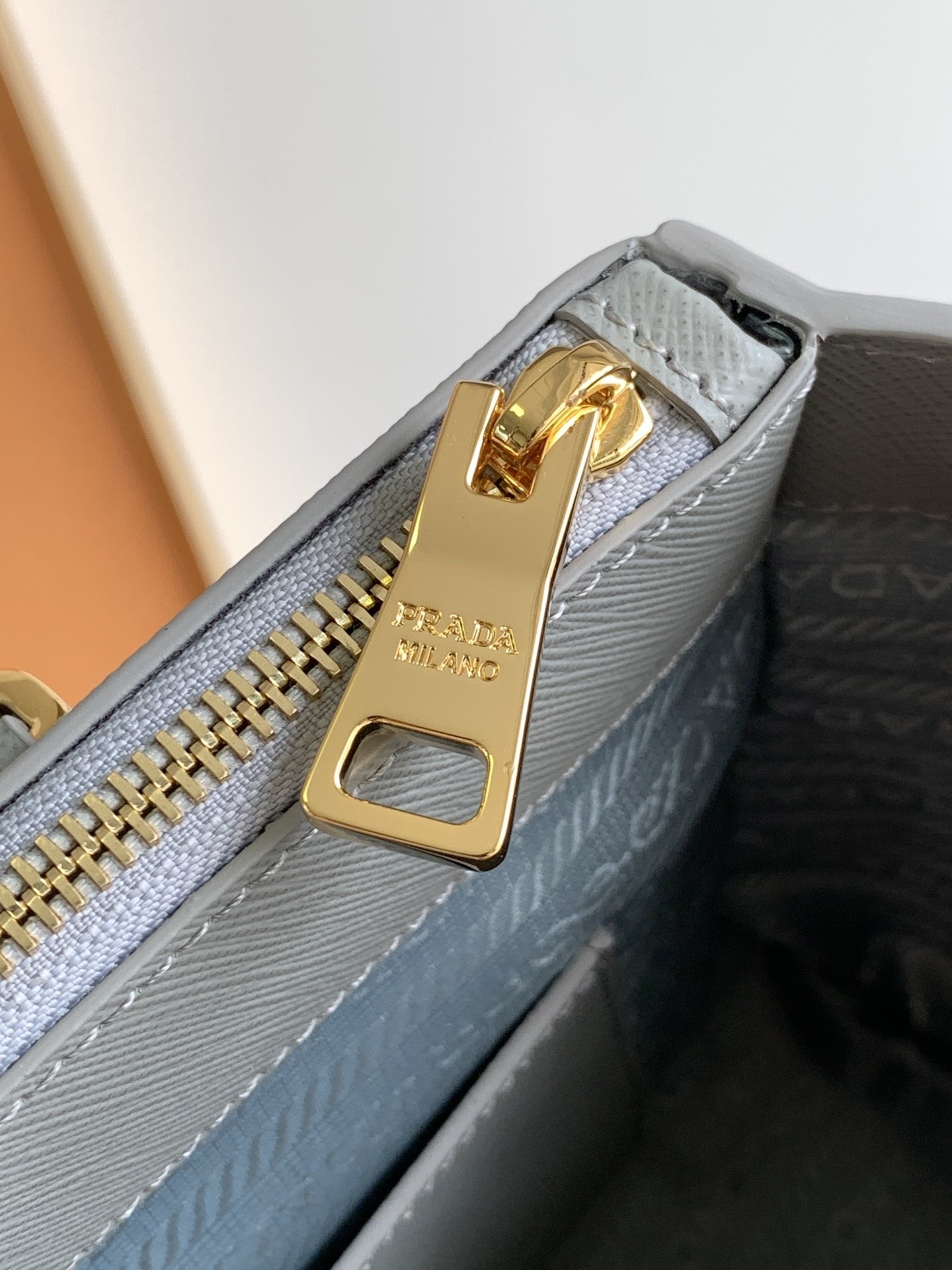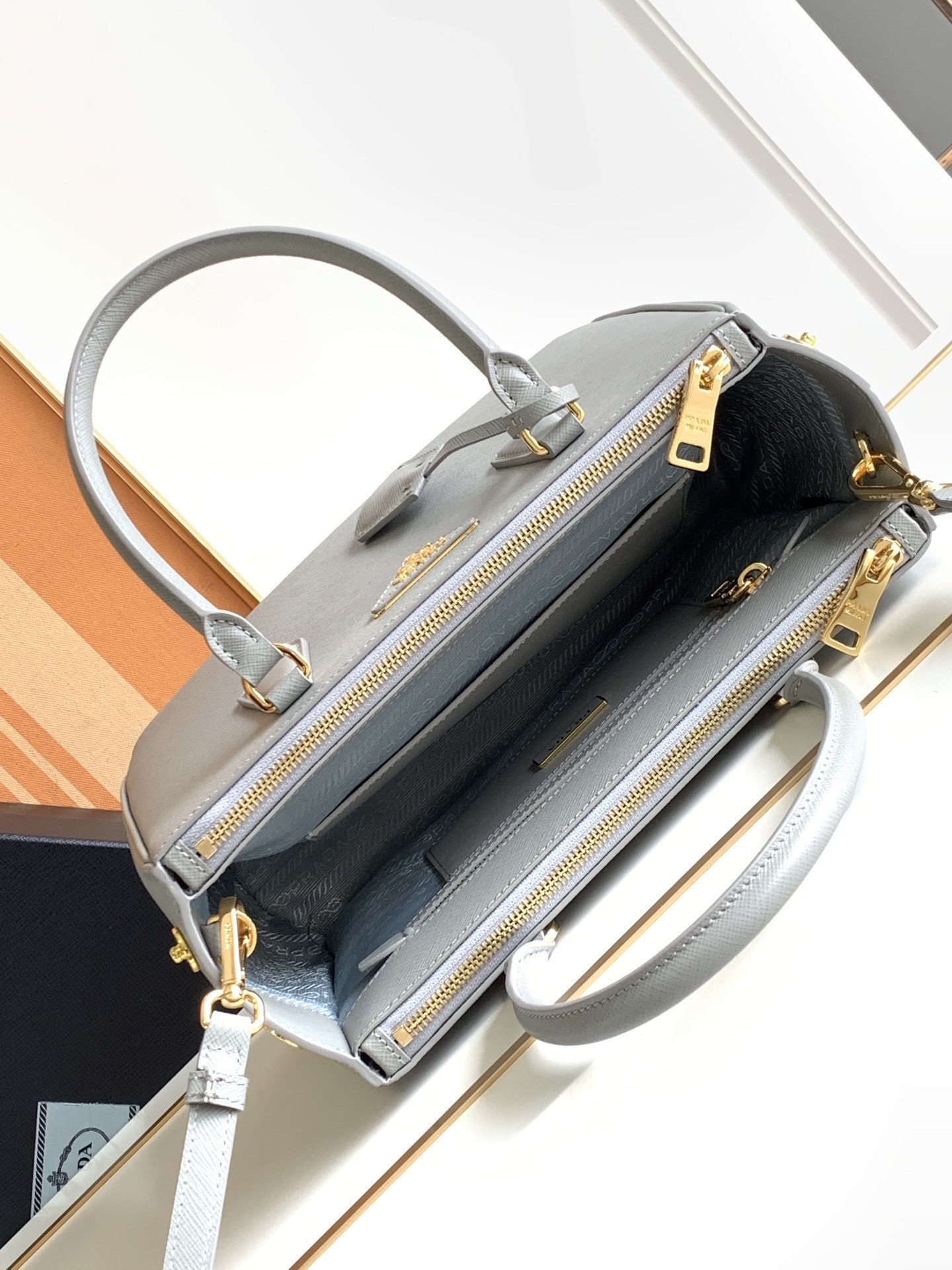 – Prada logo-print nylon lining with two pockets, including one with zipper