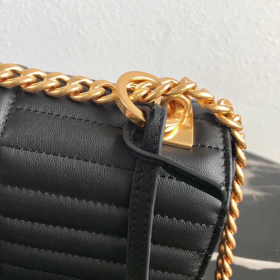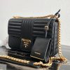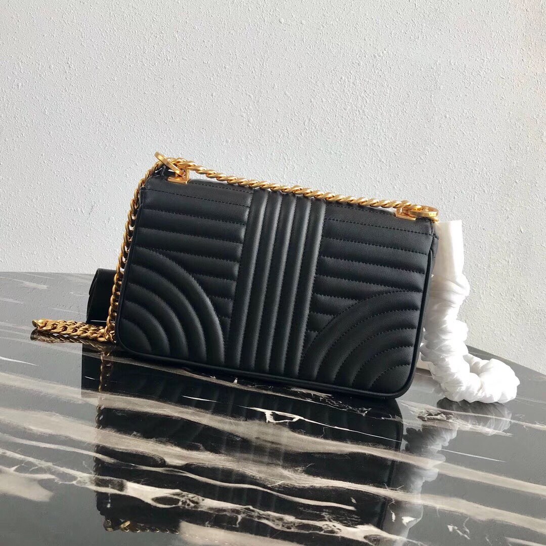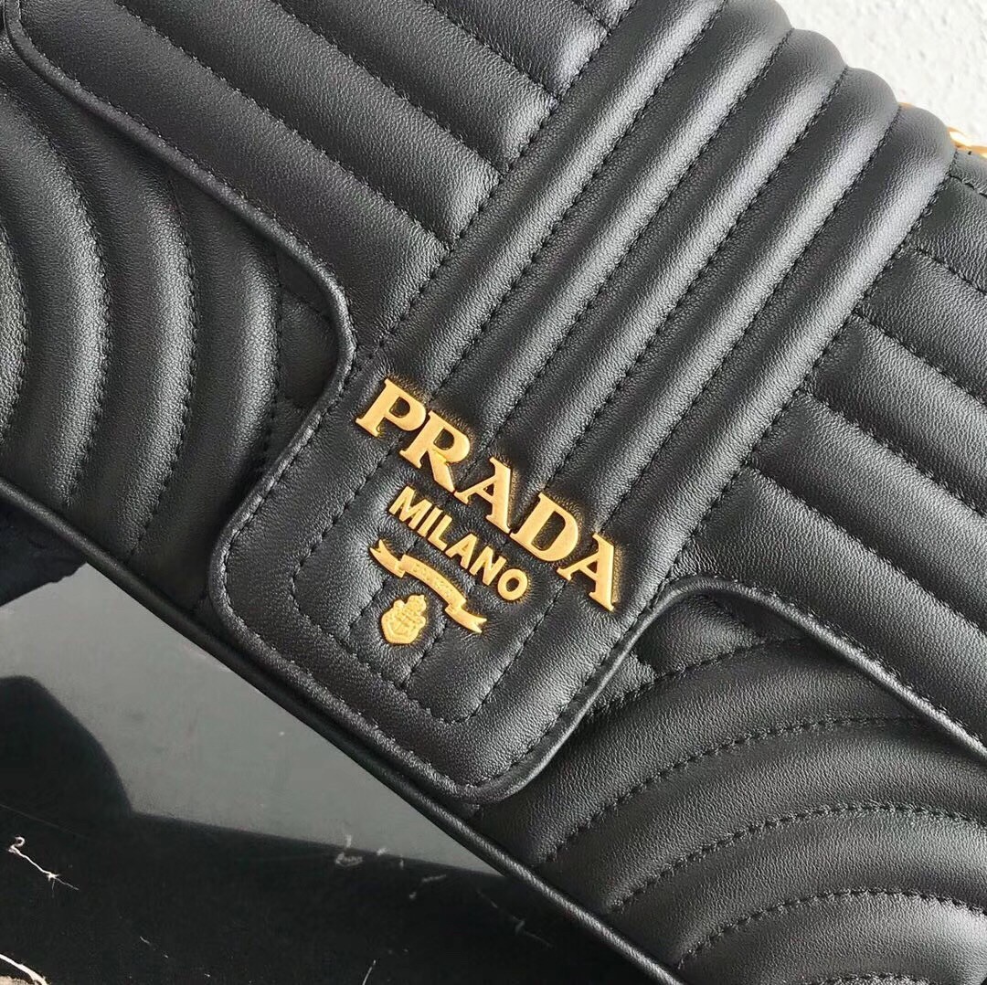 Prada has invented a complete new type of quilting. It looks modern but very sophisticated. The flap has a nose-like design and the center is crafted with the new Prada logo. This handbag is the house*s latest design and it looks like it will pave its way to the iconic status. Comes with a long chain strap for shoulder and cross body carry. The durable calfskin leather makes sure you can be fashionable without the need to baby this bag.
