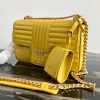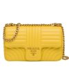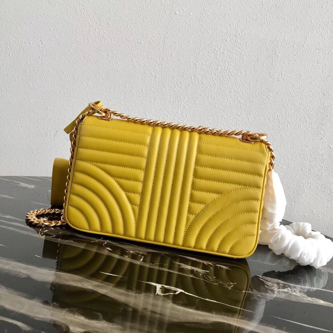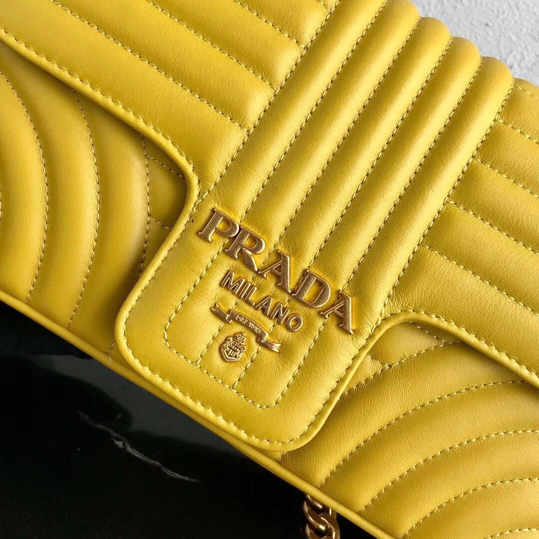 Prada has invented a complete new type of quilting. It looks modern but very sophisticated. The flap has a nose-like design and the center is crafted with the new Prada logo. This handbag is the house*s latest design and it looks like it will pave its way to the iconic status. Comes with a long chain strap for shoulder and cross body carry. The durable calfskin leather makes sure you can be fashionable without the need to baby this bag.