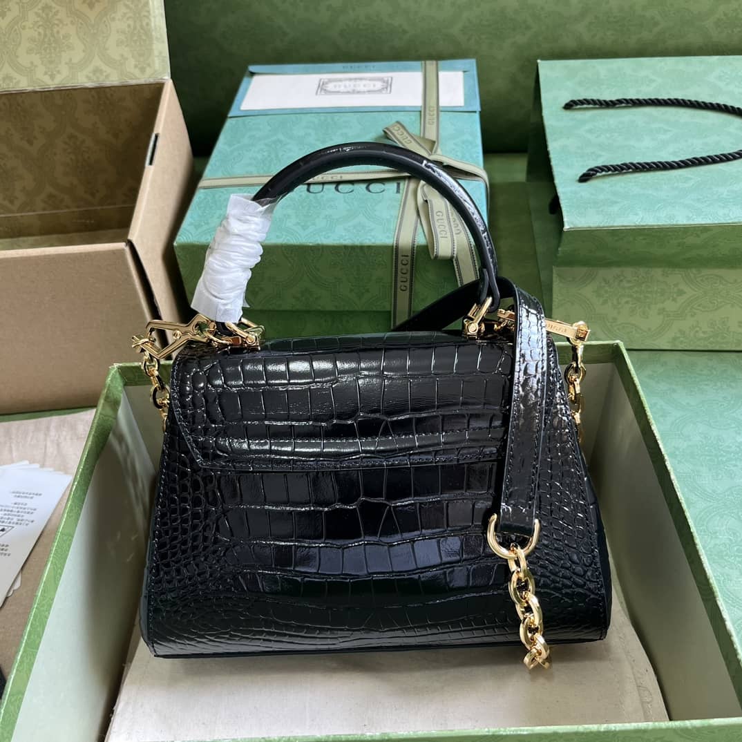 This top handle bag is more than just a fashion statement; it’s a versatile accessory that fits seamlessly into any wardrobe. Whether you’re heading to a business meeting. a casual brunch. or a glamorous evening event. the Gucci Top Handle Bag is the perfect companion. Its spacious interior provides ample room for your essentials. while the multiple pockets keep your belongings organized and easily accessible.