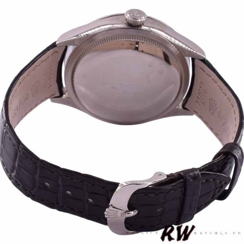 Rolex Cellini Date 50519 Brown Leather Silver Dial 39mm Mens Replica Watch has a white Gold 39 mm Round Case with Screw Down Crown and a White Gold Bezel.Scratch resistant sapphire crystal.Silver sunburst guilloche dial with raised polished baton hour markers. Fine printed minute/seconds track. Date subdial at 3 o”clock aperture. Brown Leather Bracelet will look great on your wrist with white gold tang buckle.