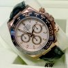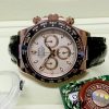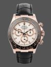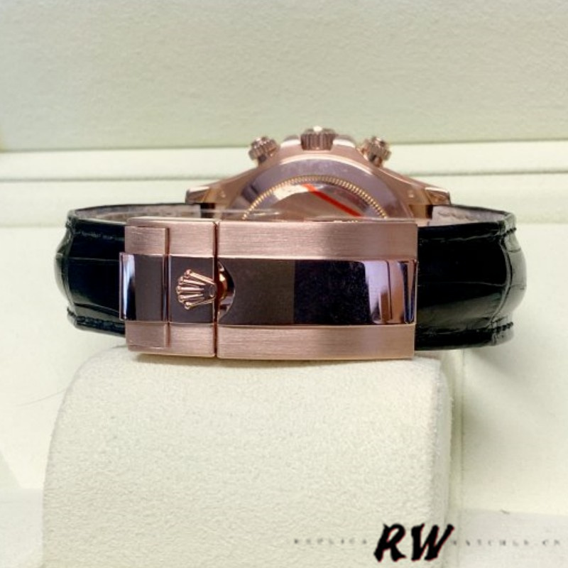 Rolex Cosmograph Daytona 116515 Ivory Dial 40mm Mens Replica Watch features a 40mm Everose gold case with a black Cerachrom bezel surrounding an ivory dial on a brand new black alligator strap with an Everose gold deployant buckle. Functions include hours, minutes, seconds and chronograph.