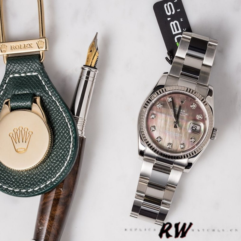 Rolex Datejust 116234 Black MOP Diamond Dial Automatic 36mm Unisex Replica Watch.This watch will become the jewel of your luxury watch collection. Round Stainless Steel Case and Bracelet, Fixed Fluted White Gold Bezel. Black Mother-of-Pearl dial adorned with small diamonds and sweeping hands. Date Display Set at the 3 O’clock Position. Stainless steel oyster bracelet with a fold over clasp.